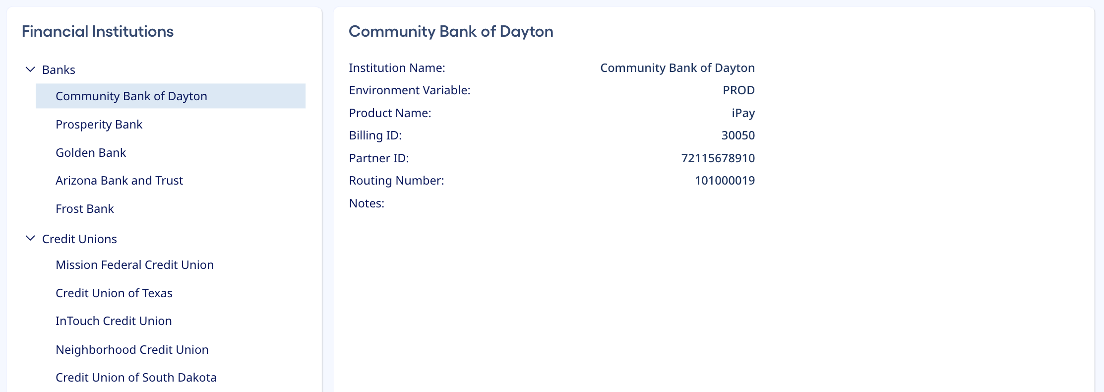 The master list below represents a list of financial institutions, displaying the FI name for each list item. The user selects an FI in the master list on the left to see its detail displayed on the right.
