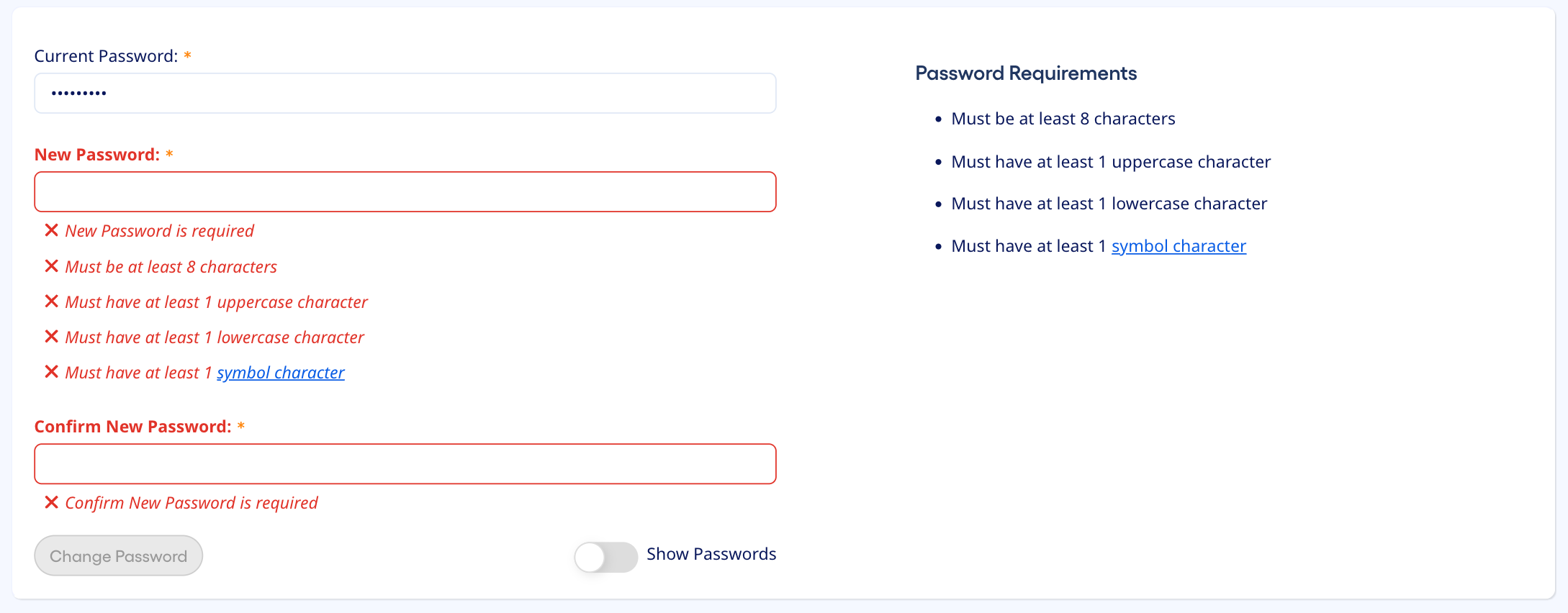 Displays a progress bar with a themed color background and a description that indicate the relative strength of a new password value entered by the user in a Change Password view