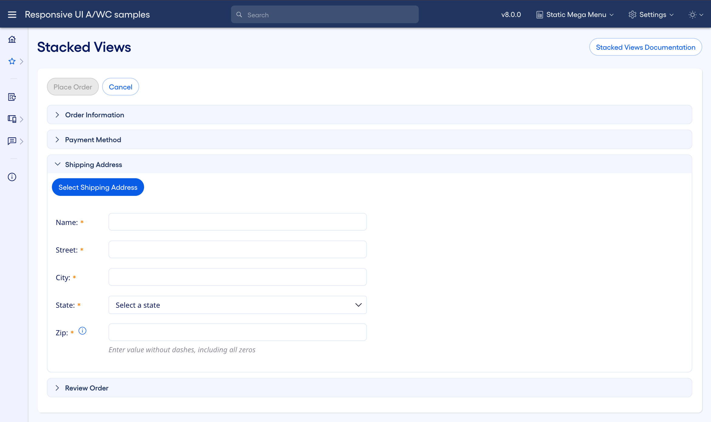 Stacked views allow you to open additional view components over a base view in order to complete a complex secondary task while not leaving a primary task. For example, if the primary action is to create a new order, but the user needs to update a saved address during the process, they can do so without losing their place in the order process.