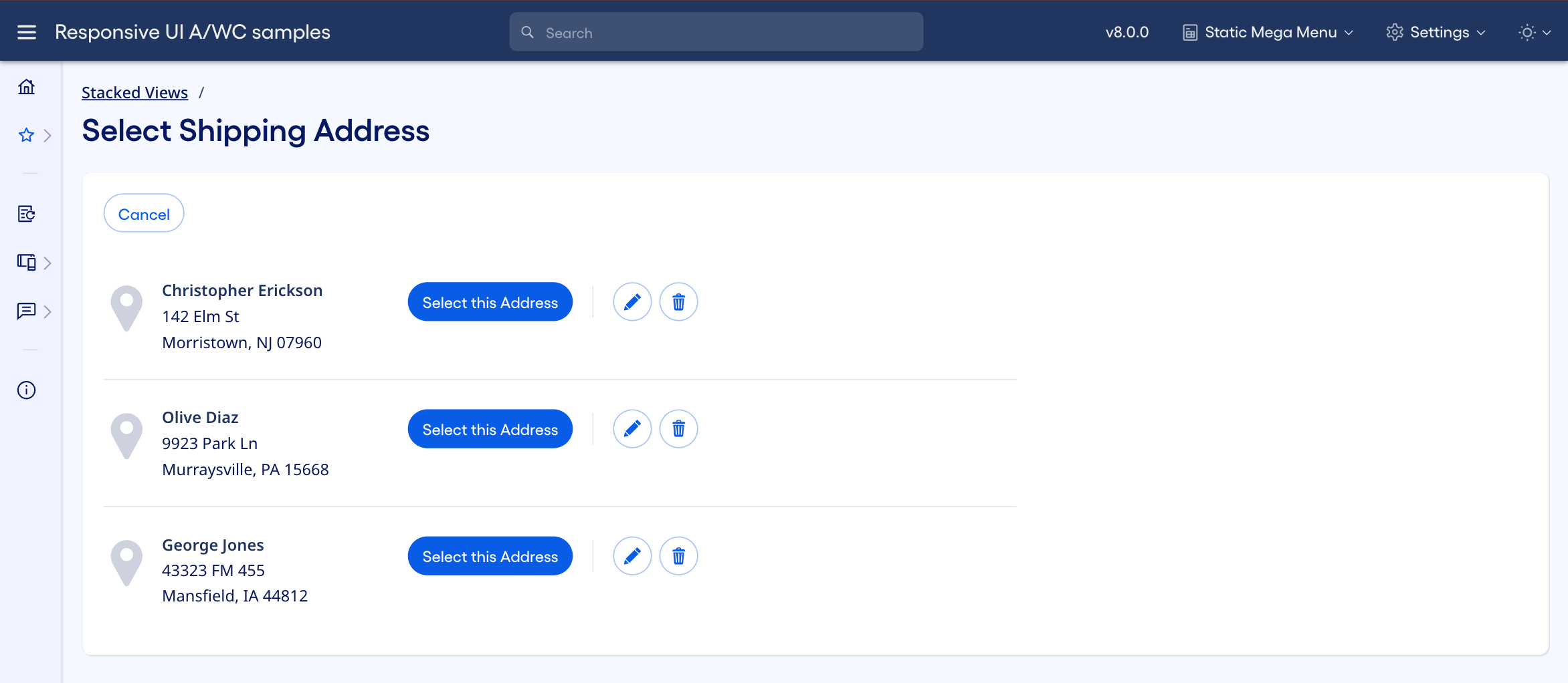 - The user can press the Select this Address button for any predefined address to use that address as the shipping address and return to the original order form. This is the primary action in the view. The application removes this stacked view when this happens.