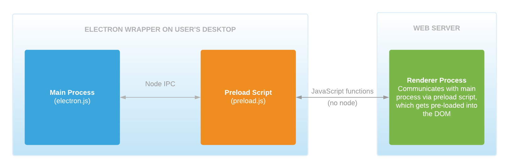 • The downside is that communication between the main process and the renderer process requires extra steps in order to avoid introducing potential security risks. The simple IPC communication mechanism in Electron is node-based. If your app is hosted on a server, you absolutely do not want to turn on node integration within the hosted renderer process (your web app) as this is a major security risk, so we have to set up a couple of extra layers to the communication in order to preserve security. We talk more about that below.