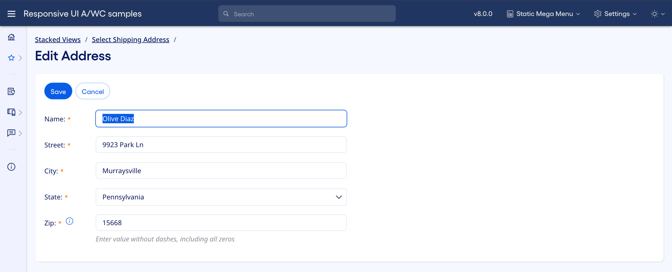 - The user can press the Save button to save the address update and return to the shipping address selection. The application removes this stacked view when this happens.