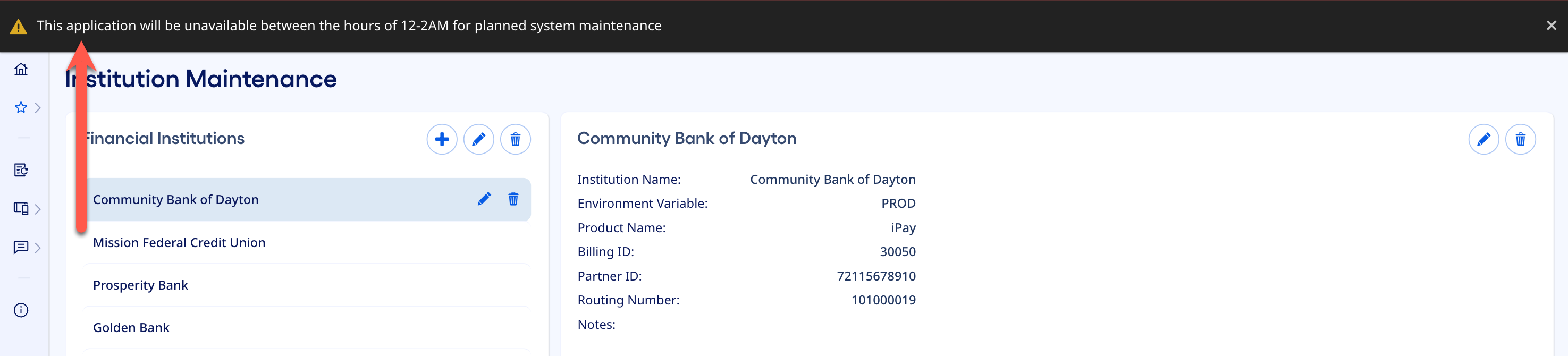 bannerText: 'This application will be unavailable between the hours of 12:00 and 2:00 AM due to planned maintenance'