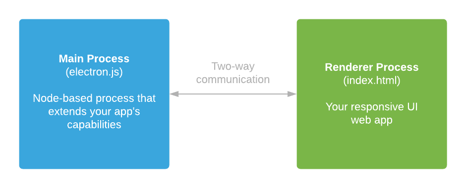 These processes use two-way communication to coordinate activities. The renderer process (your web app) typically initiates that communication, whenever it needs the main process to perform some native functionality on its behalf. Depending on what the renderer process requests, the main process may simply perform the requested activity (say launch Excel) or it may respond with some kind of results, like a listing of files in a particular directory. However, the main process can also asynchronously initiate communicate with the renderer process, typically to let it know that some native-level event has occurred.