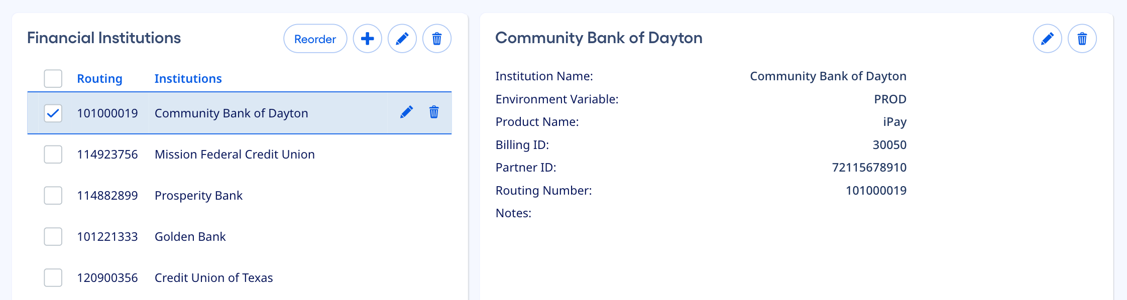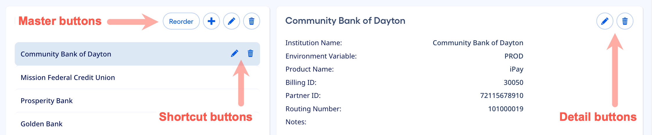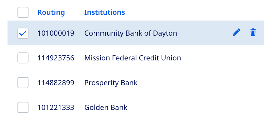 Using the example above, pressing the Edit shortcut button in the Golden Bank list item would immediately initiate the Edit functionality for that institution. It would also select the Golden Bank item in the master list, providing the user with even more visual confirmation that they’re editing Golden Bank.