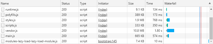 To confirm it’s working, load your application in a browser. When you navigate to the new /LazyLoad url, you will see a new js file loaded in the Network tab of your Inspector window.