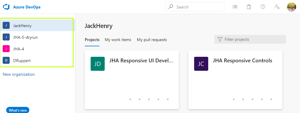 - The next step can vary depending on your Azure organization. At https://dev.azure.com, the organizations you belong to are listed on the left.