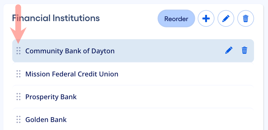 Once the user presses the “Reorder List” toggle button, drag-and-drop functionality is now available. We see a drag grip displayed at the left edge of each master list item, signaling to the user that drag and drop is now available in the list.