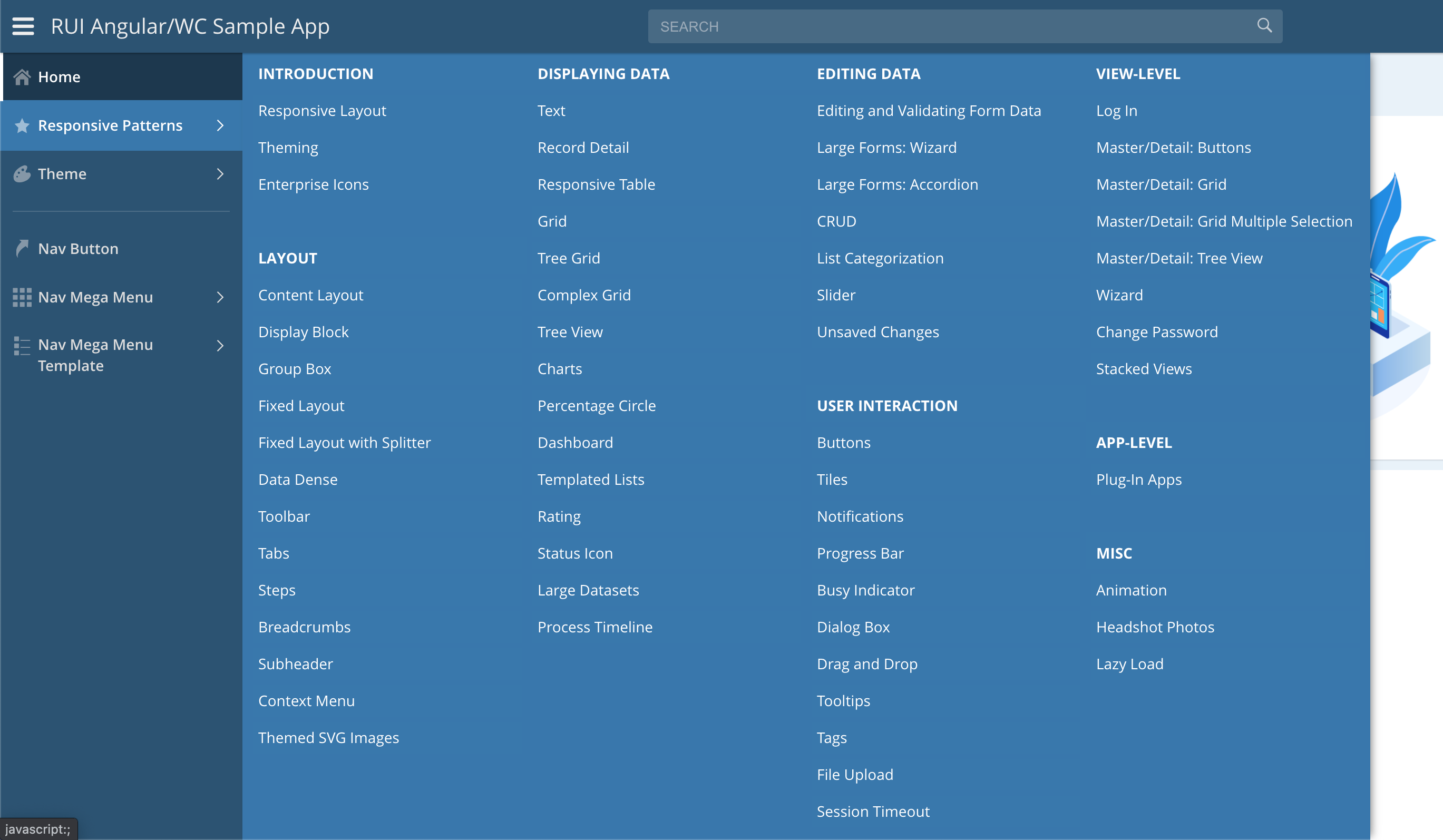 The rui-mega-menu-template component has a route property to specify the item’s route options if the template links to a view within this Angular app when clicked; otherwise handle the rui-mega-menu-option-click event. All text is specified within the template content so we don’t need a separate property for that.