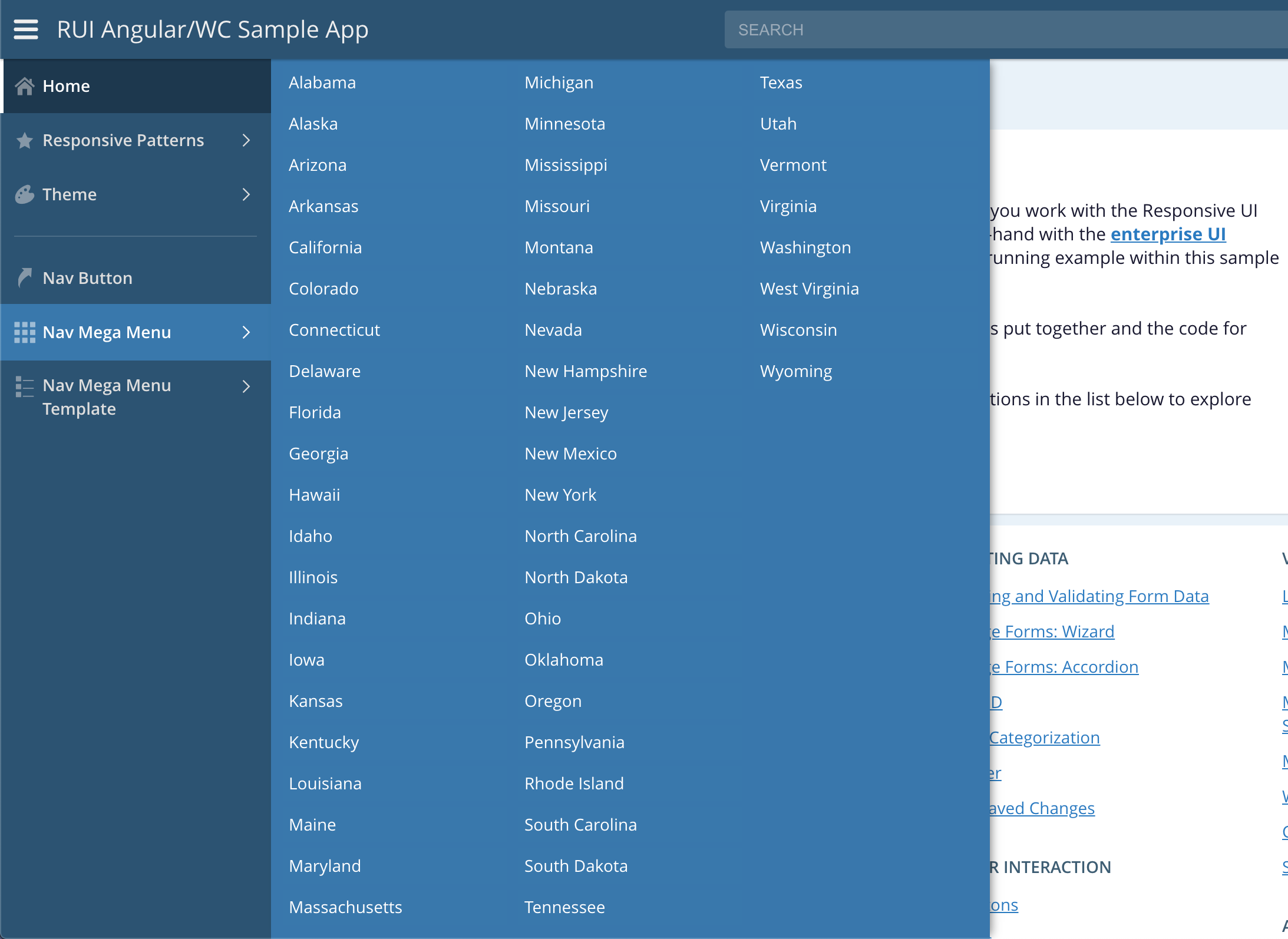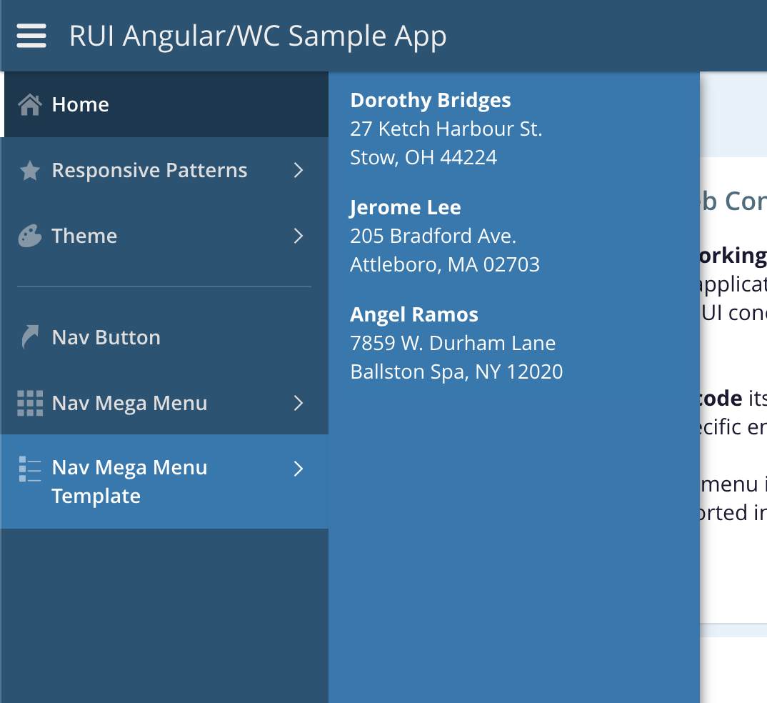 The rui-nav-mega-menu component displays as a fly-out menu at tablet and desktop sizes, but its elements display as part of the nav menu at mobile size. Mega menu templates do not have enough room to display well at mobile size, so you must specify a single text value to display at mobile size in addition to the more complex template displayed at larger screen sizes. To do this, first add a span to the template that has the rui-visible-mobile CSS class. This span should only display a short text value. Then add the rui-hidden-mobile CSS class to the outermost element that contains the more complex template you want to display at larger sizes. If you fail to provide a simple template for mobile size, the complex template will display embedded in the nav menu at mobile size, which almost always will result in a poor user experience.