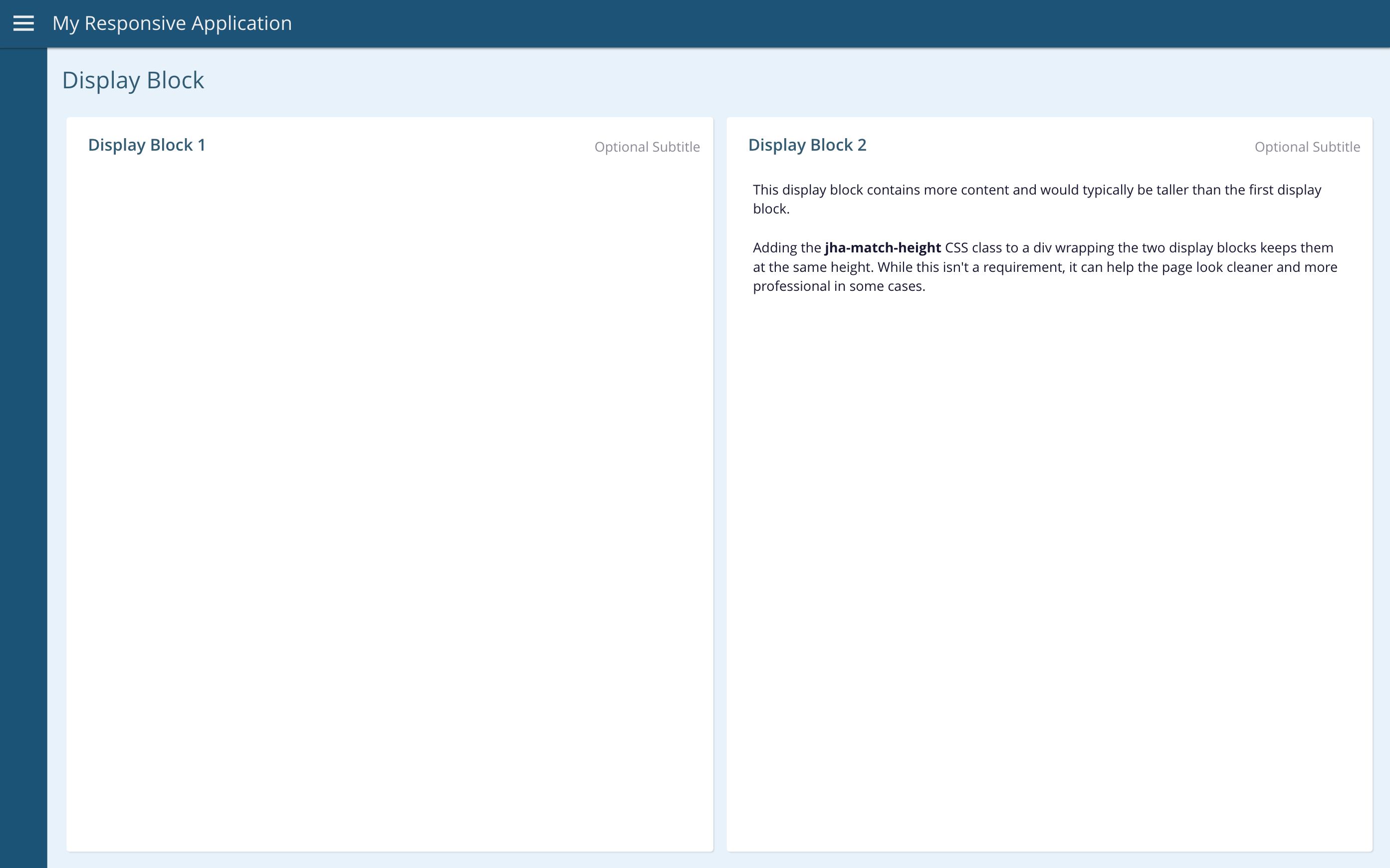 If you have more than one display block in the same visual row and you’re not using fixed layout, it can be helpful to use the jha-match-height CSS class to match all of their heights. The jha-match-height CSS class uses flexbox layout to split the width evenly between all display blocks in the row, keeping their heights matching. At mobile size, the display blocks automatically drop into a vertically scrolling list.