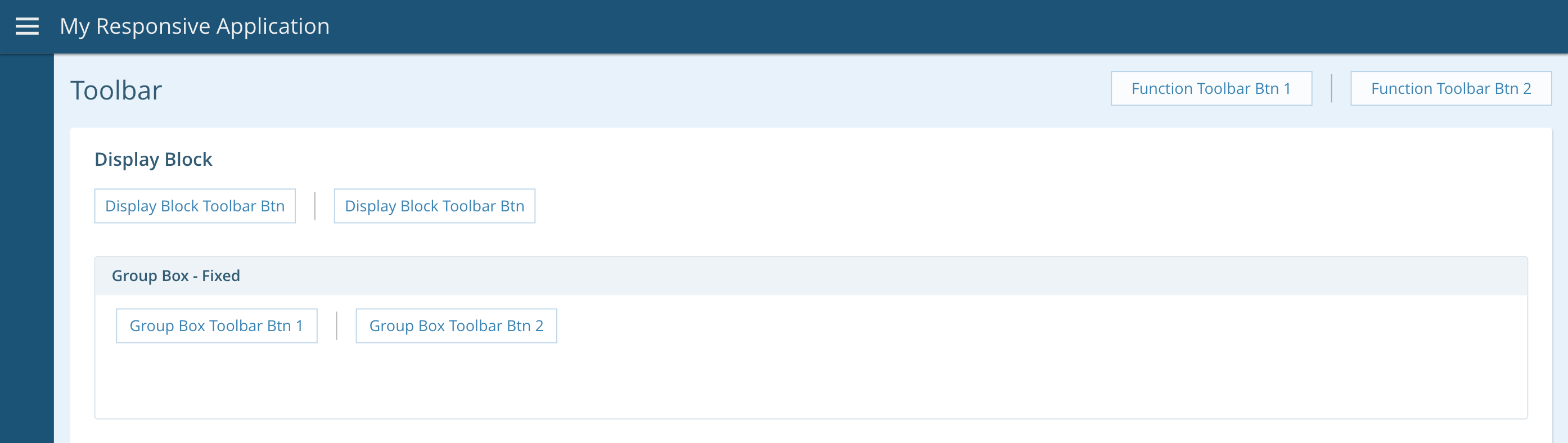 The function toolbar, display block toolbar, and content toolbar (used for group boxes, tabs, and other container components) are all invisible, so there are no design components for those toolbars. To design these toolbars, simply group the toolbar elements within in a single horizontal strip and vertically center them.