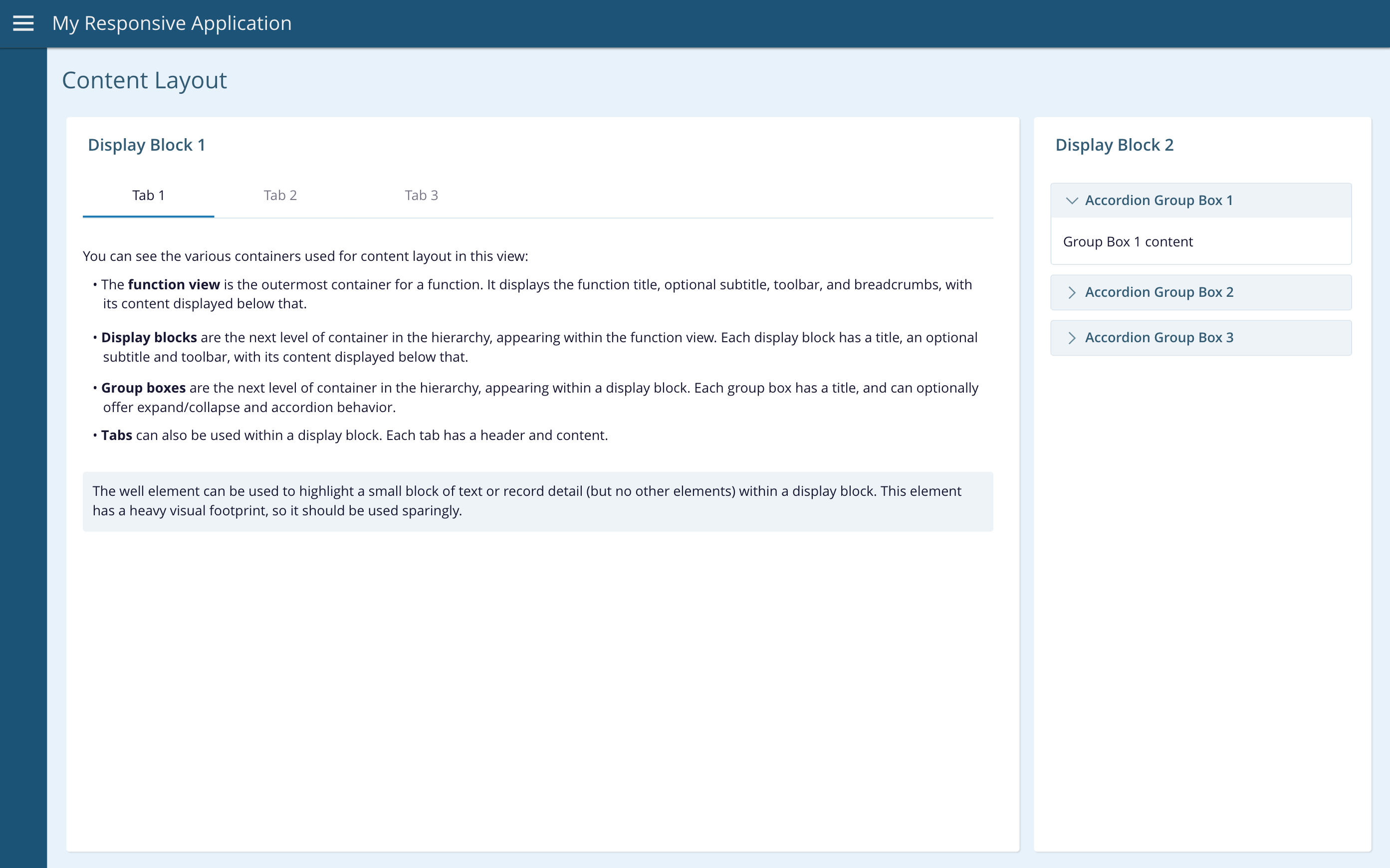 The well element can be used to contain a small block of text or record detail (but no other elements) within a display block.