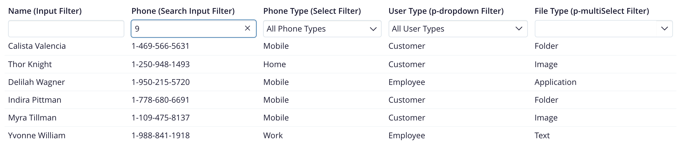 - p-multiSelect filter: The user selects one or more filter values from a p-multiSelect, which is a dropdown component that allows the user to select multiple values. The grid only shows rows that contain any of the selected values in the filtered column. The user must clear the selected values in the multiselect to remove the filter.
