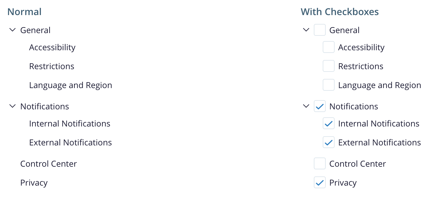 In some cases a tree view displays a checkbox next to each item, allowing the user to check and uncheck individual nodes.