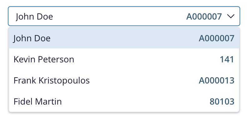 { label: 'John Doe', value: 'A000007' },