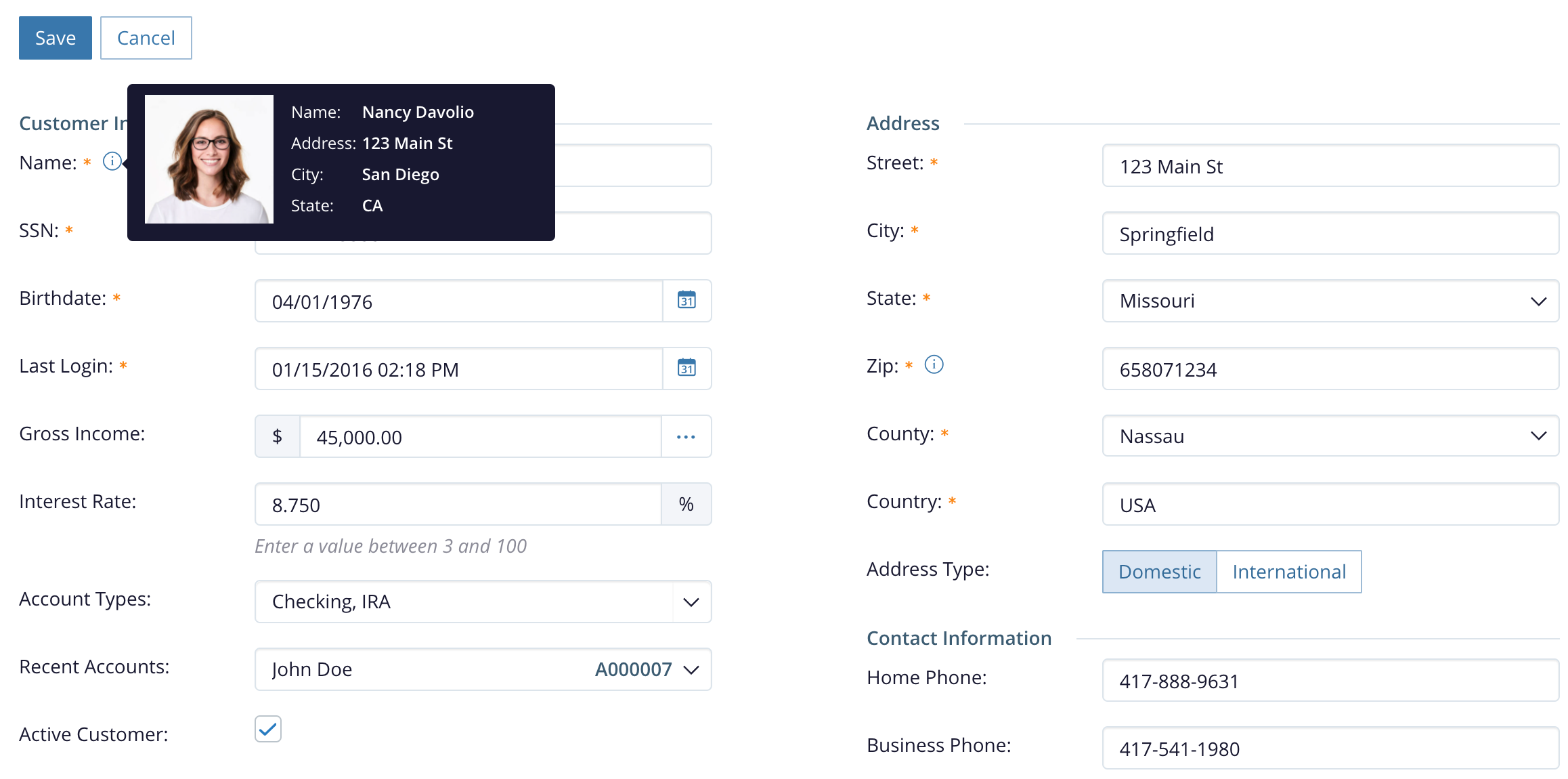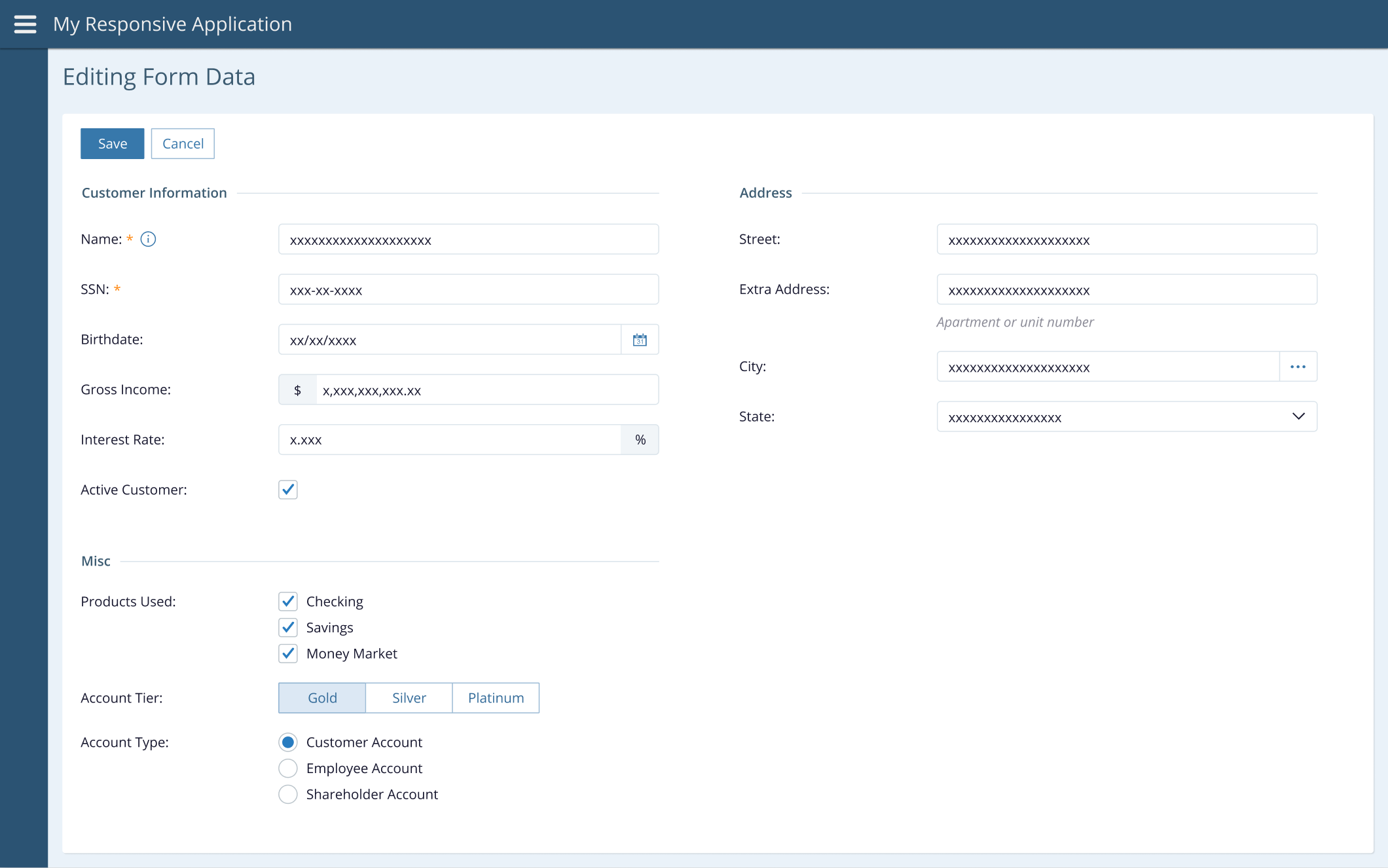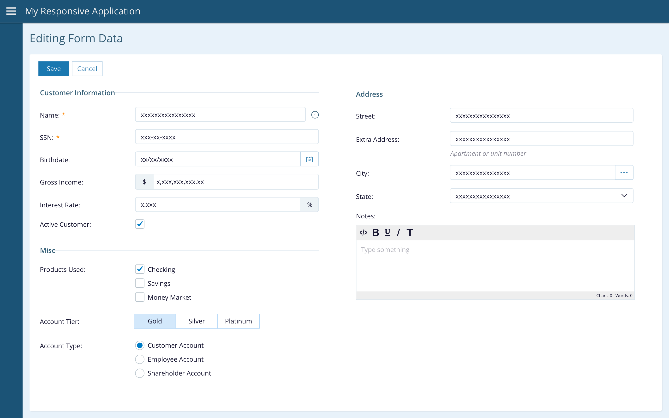 The Editing and Validating Form Data view in the Angular sample app demonstrates setting up a form with validations. We start by talking you through the process of setting up the form here, then get into more detail about different types of inputs after that.