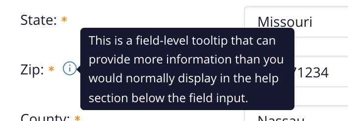 - You can optionally display a field-level tooltip to the right of any field label if that field should display additional help input in a special tooltip when the user hovers or clicks the icon.
