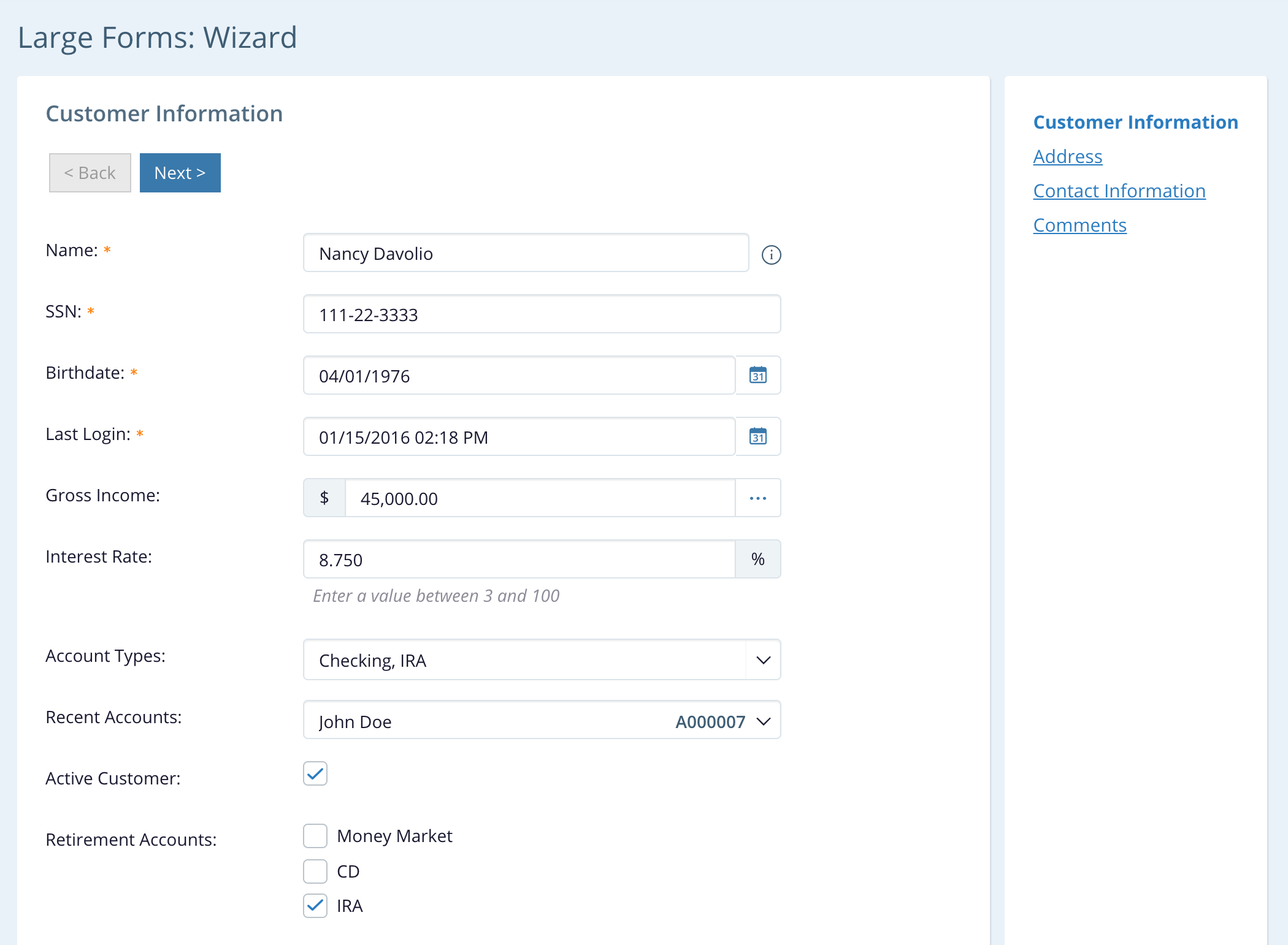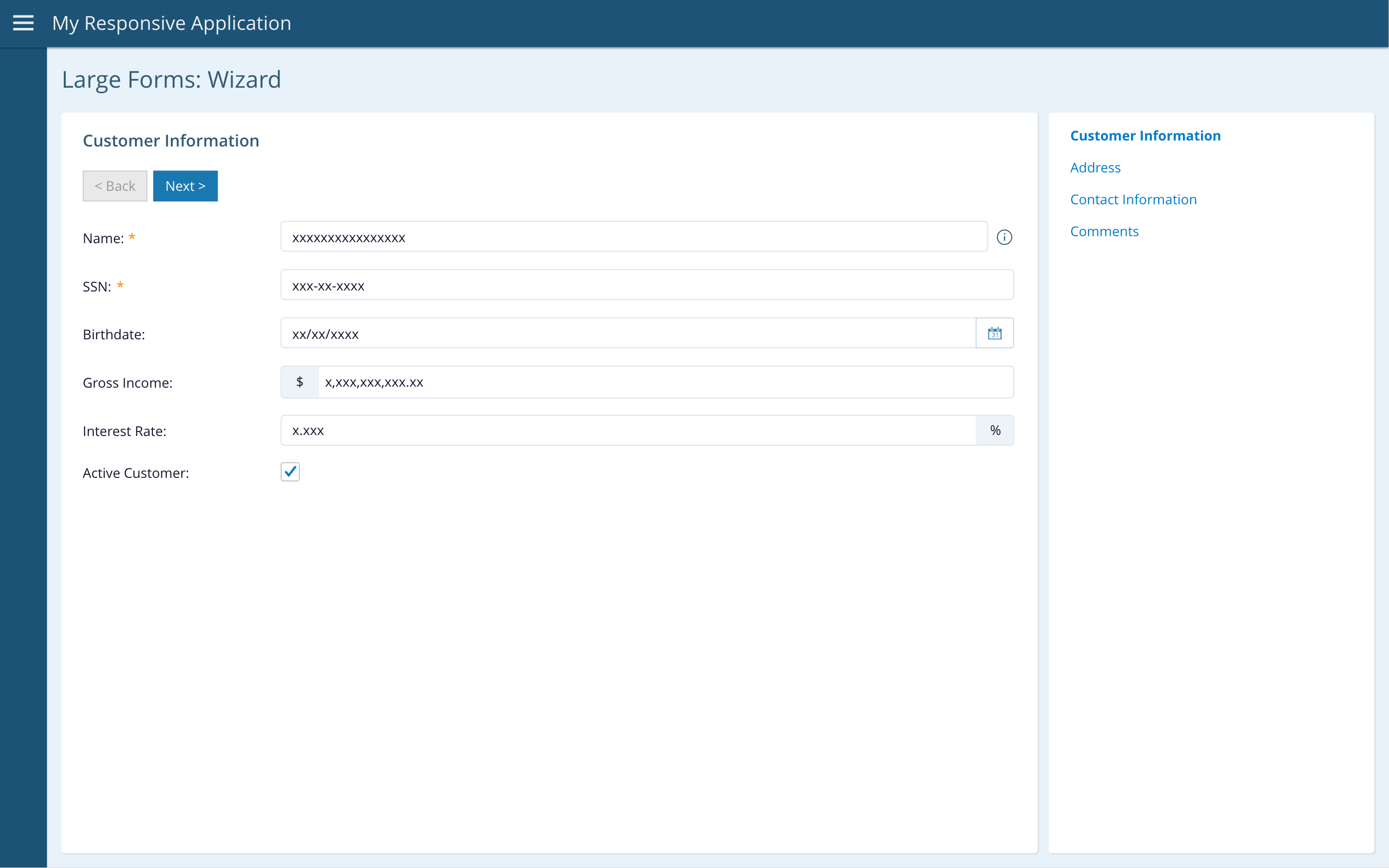 We support two techniques for breaking forms into smaller sections that work well across all screen widths: accordion group boxes and wizards. The wizard approach is described below. See Large Forms - Accordion for details on using accordion group boxes for large forms.
