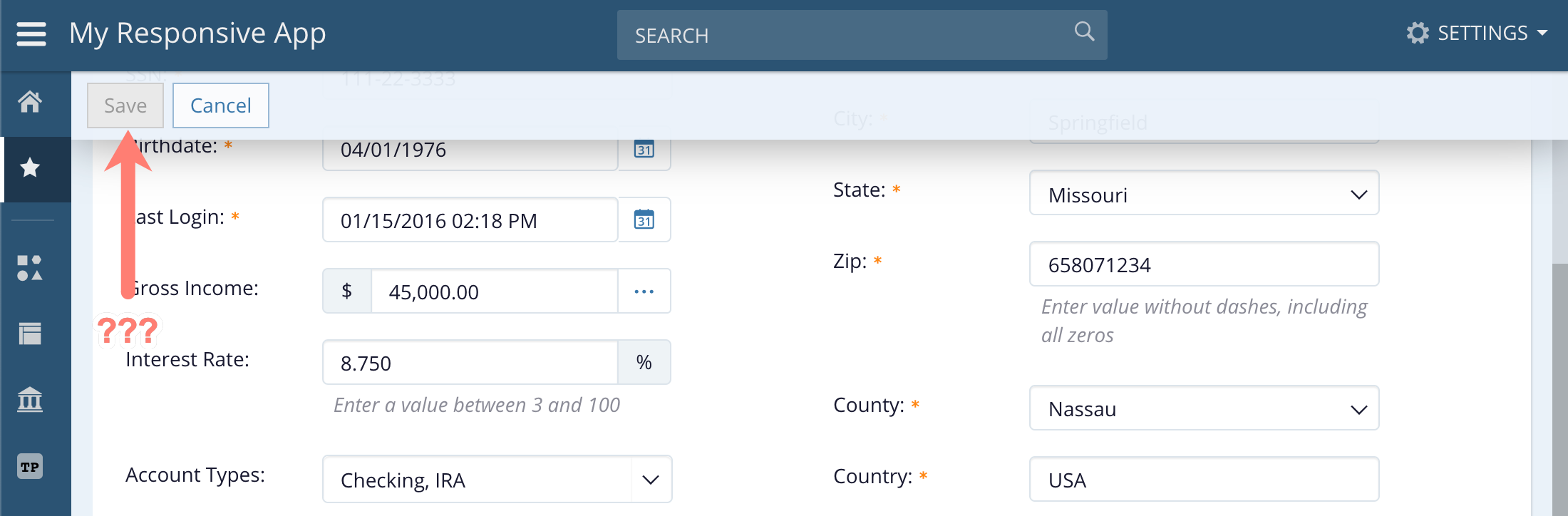 And that’s if the user even knows that there are validation errors in the first place. If all fields with validation errors are currently scrolled out of view, the only clue that the user has that validation errors exist is the fact that the Save button is disabled.