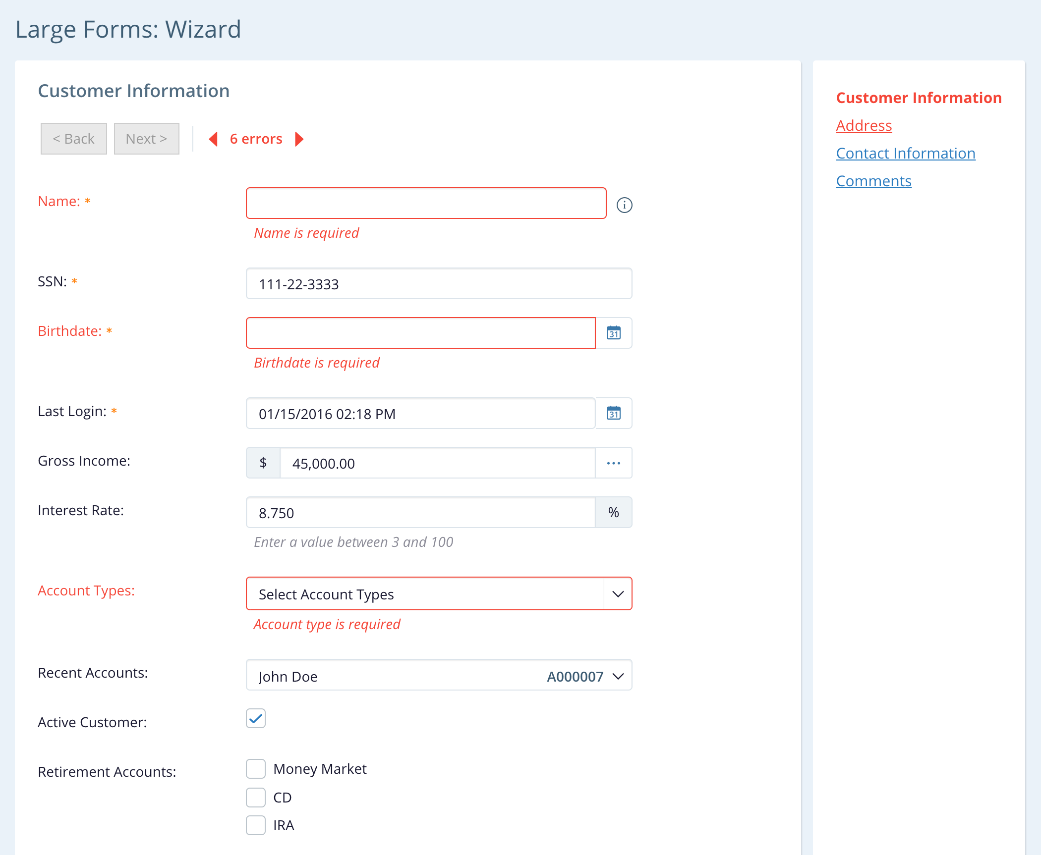 Another challenge with large forms is making it easy for the user to find and fix validation errors in the form inputs.