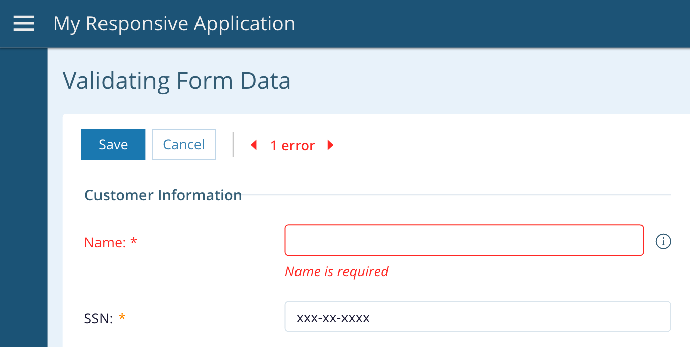 Once the form is set up, add a jha-validation-error-navigator component to the rui-toolbar within the form’s display block. Bind the jhaForm property to your FormGroup and bind the jhaErrorNavigation property to a newly created event handler. If your form uses custom form validators, bind an array of JhaCustomValidationMap elements to the jhaCustomValidationMappings property.