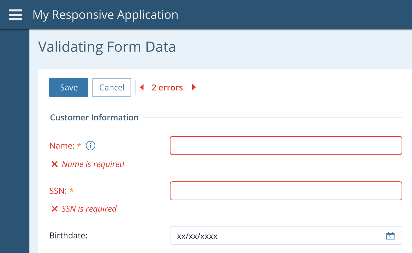 - The validation error navigator specifies the number of validation errors present in the form. Its very presence is a reliable indicator to the user that the form contains validation errors.