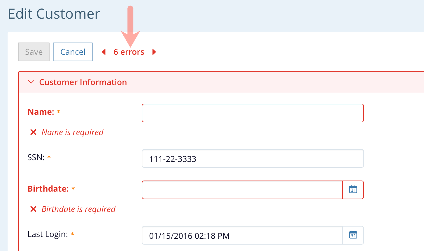 And that’s if the user even knows that there are validation errors in the first place. If all fields with validation errors are currently scrolled out of view, the only clue that the user has that validation errors exist is the fact that the Save button is disabled.