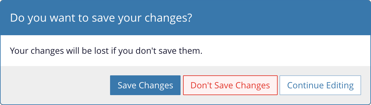 - A “Continue Editing” button with secondary styling. The user presses this button to keep their changes and continue working in the current view.