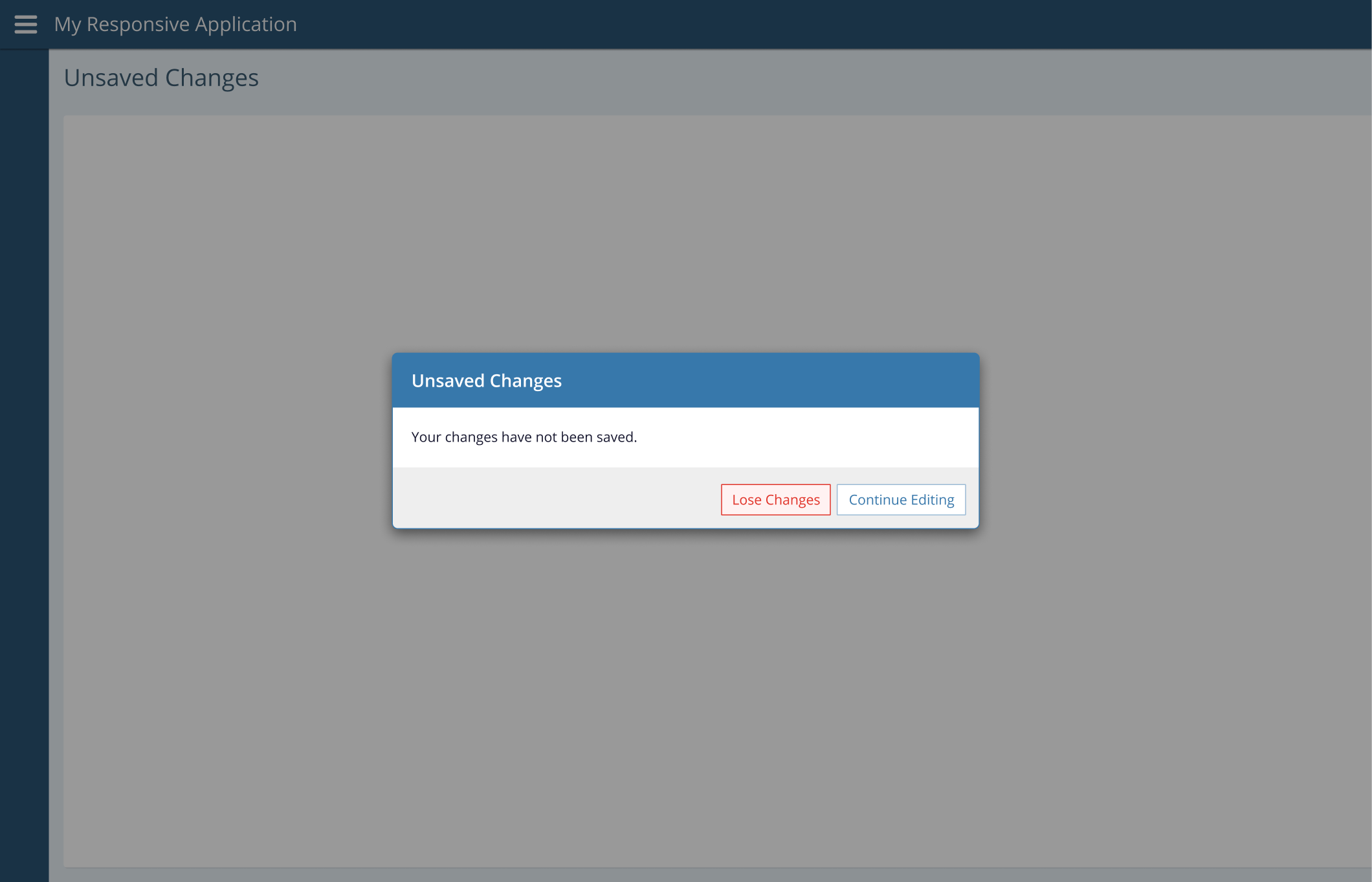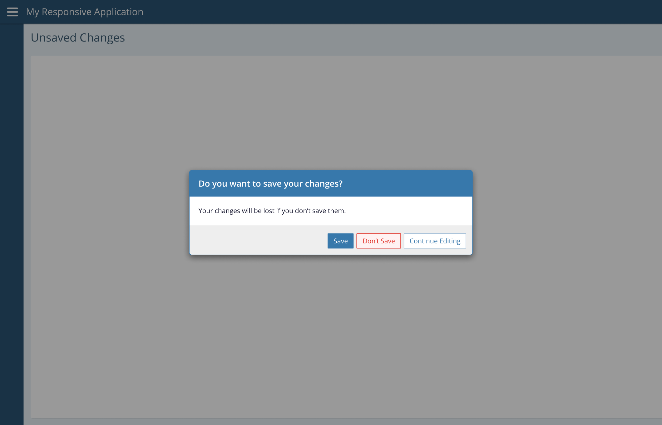 Rather than having to build your own unsaved changes detection and warning mechanism, Responsive UI provides you with a service, route guard, and specialized dialog box component to help simplify the process and provide a consistent user experience for handling unsaved changes.