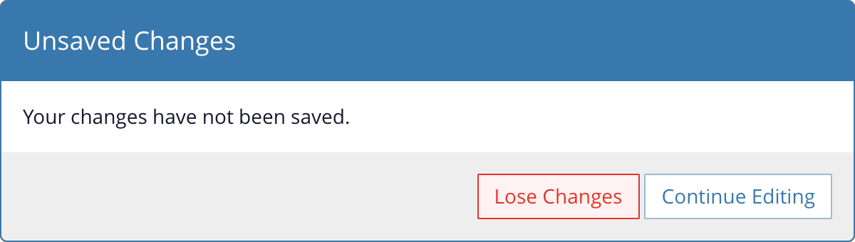 - A “Lose Changes” button with destructive styling. The user presses this button to abandon their changes, then continue with (a) navigating away from this view or (b) canceling the form changes, depending on the situation.