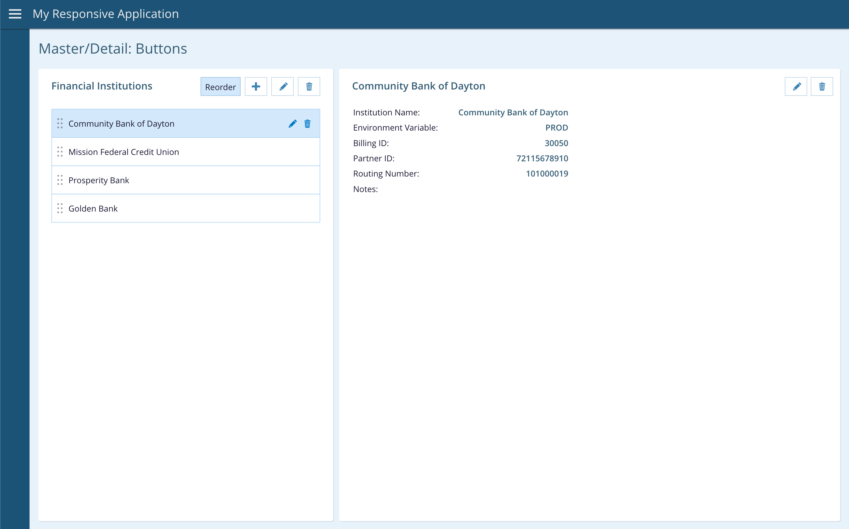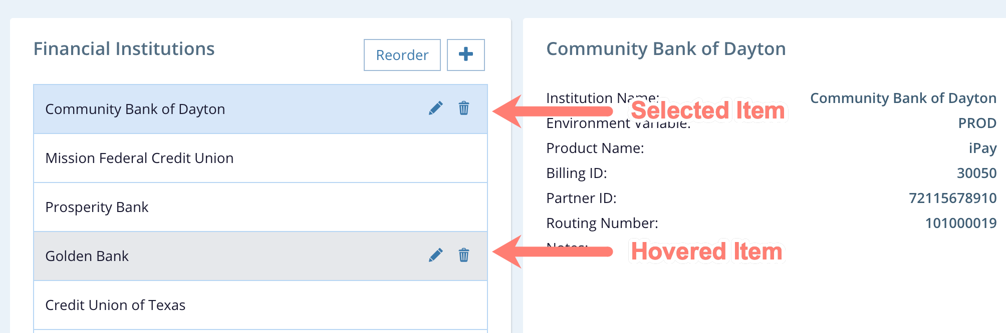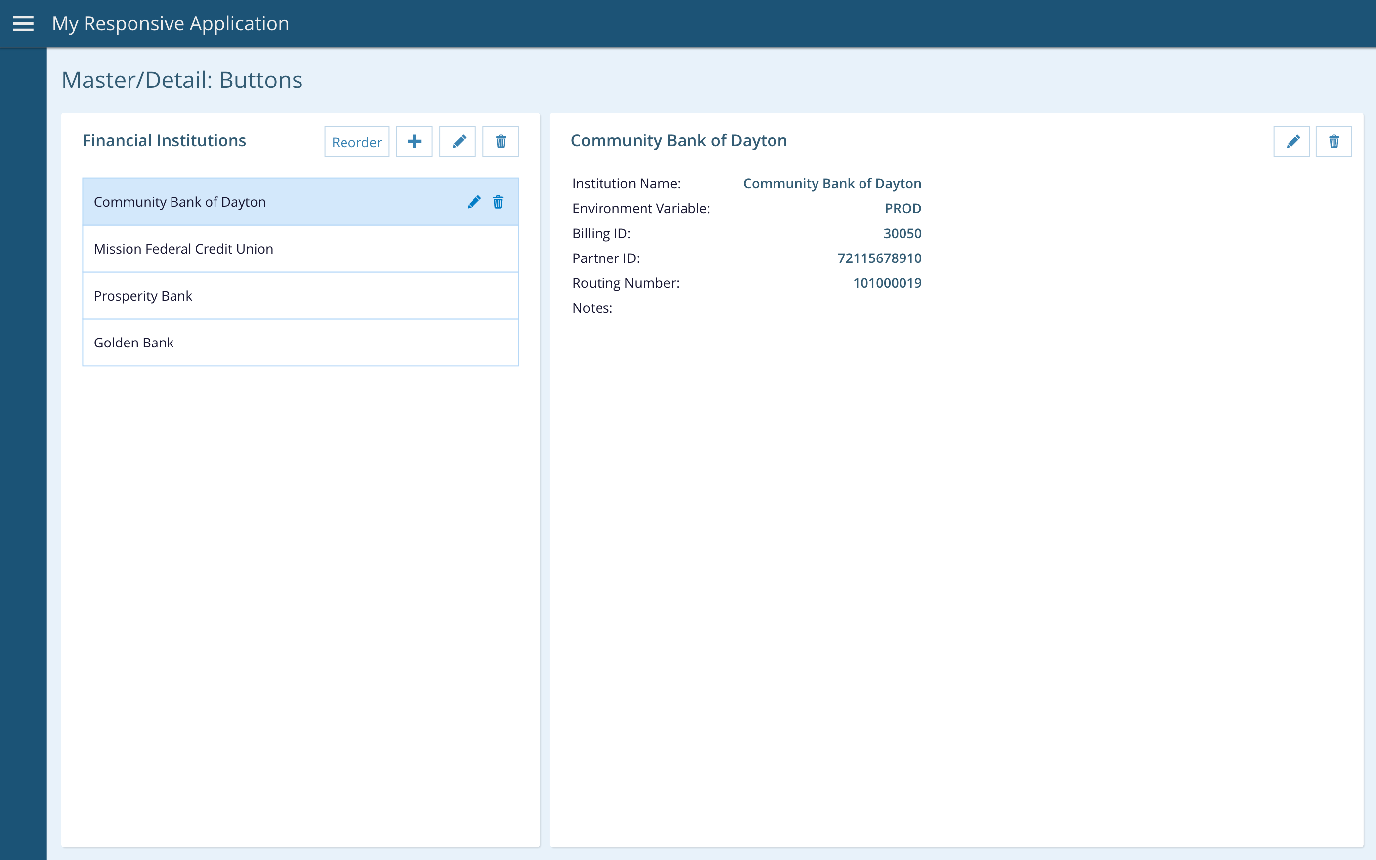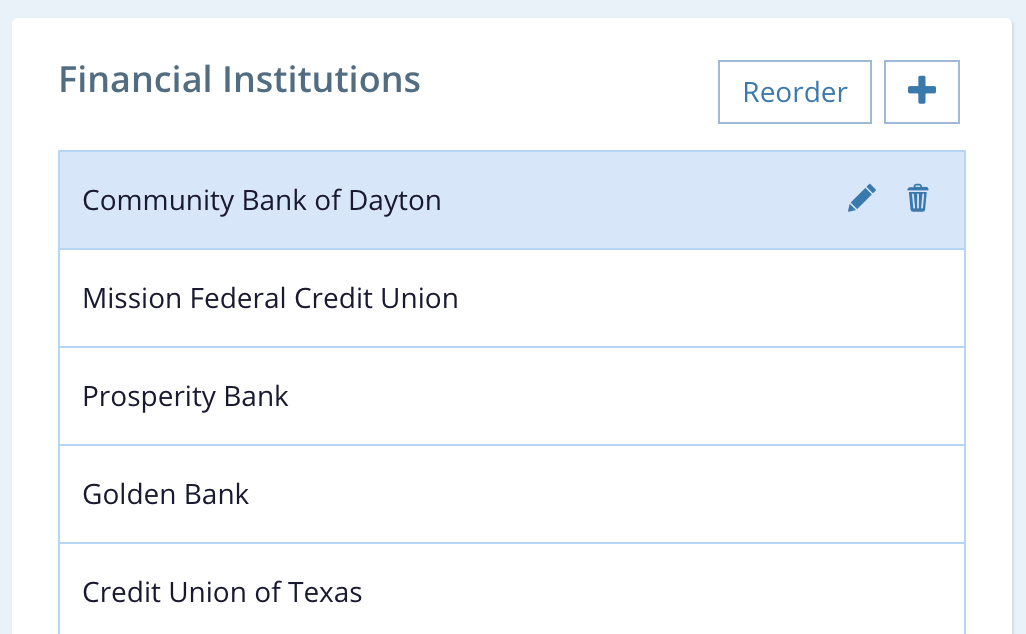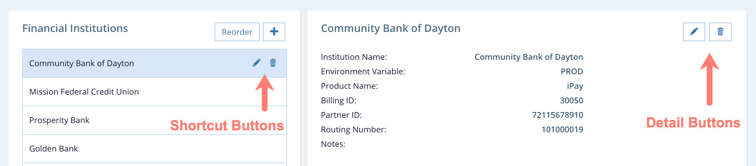 Using the example above, pressing the Edit shortcut button in the Golden Bank list item would immediately initiate the Edit functionality for that institution. It would also select the Golden Bank item in the master list, providing the user with even more visual confirmation that they’re editing Golden Bank.