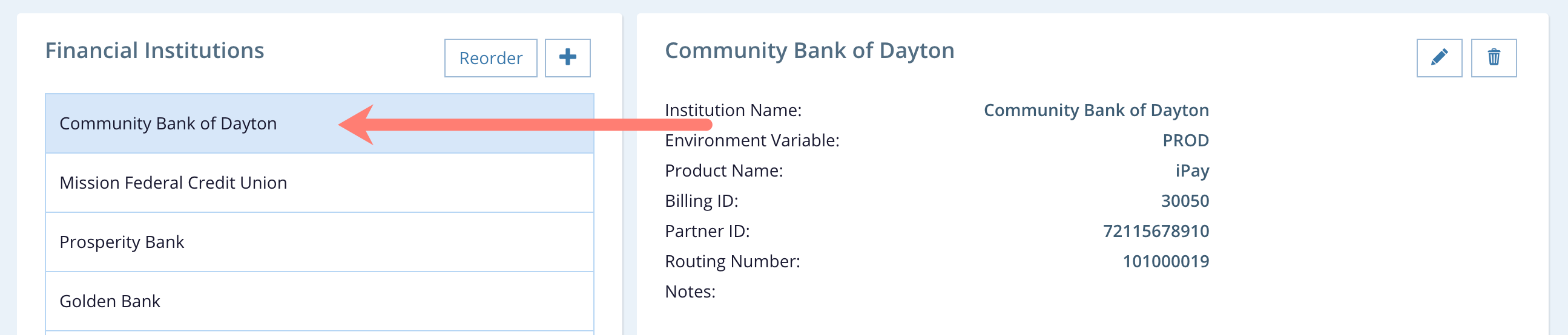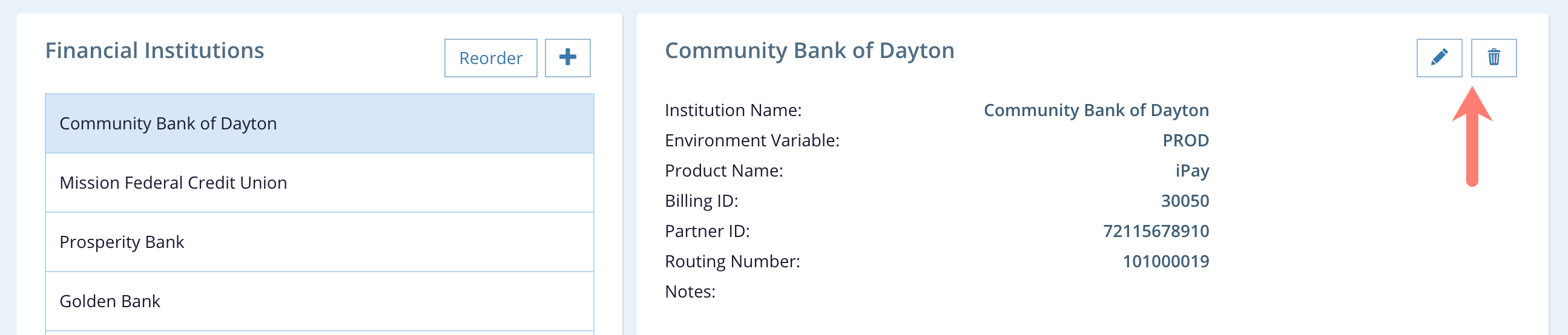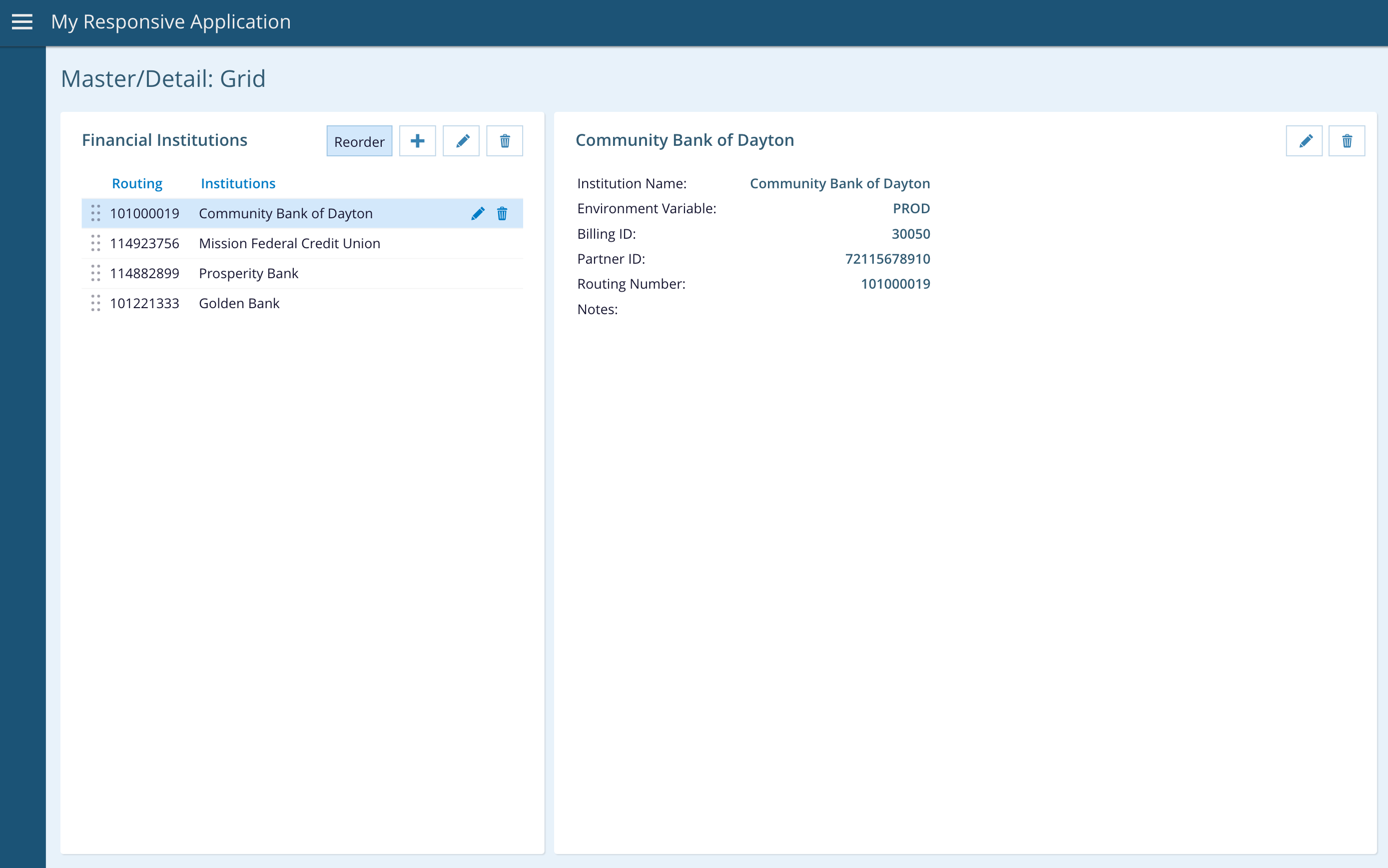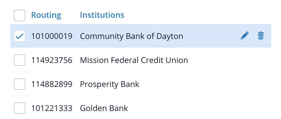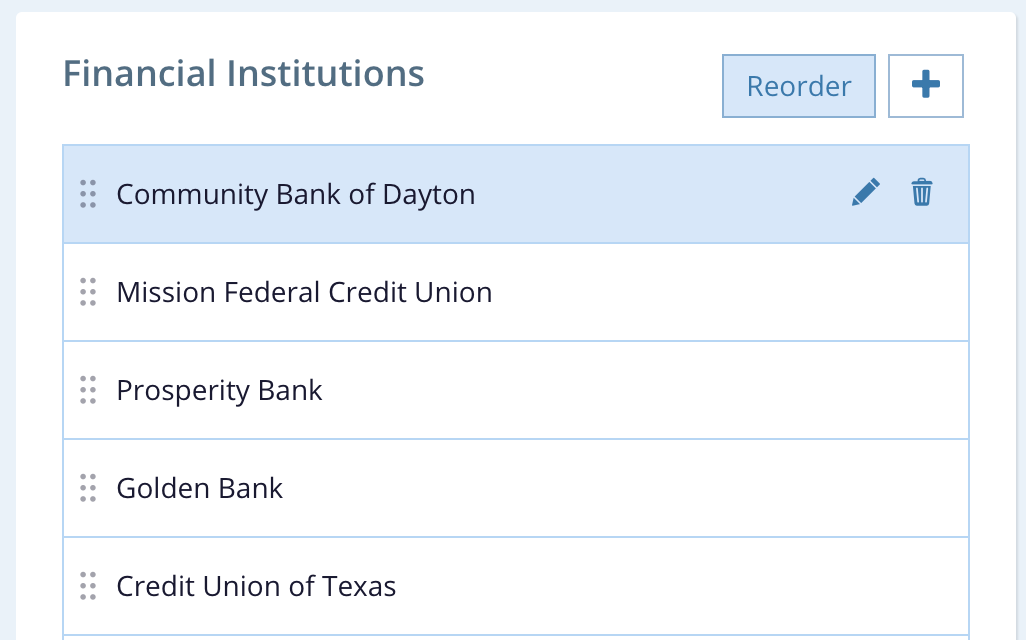 Using the example above, pressing the Edit shortcut button in the Golden Bank list item would immediately initiate the Edit functionality for that institution. It would also select the Golden Bank item in the master list, providing the user with even more visual confirmation that they’re editing Golden Bank.