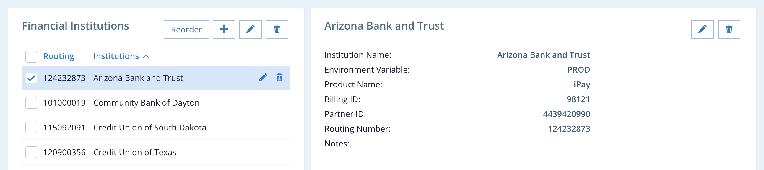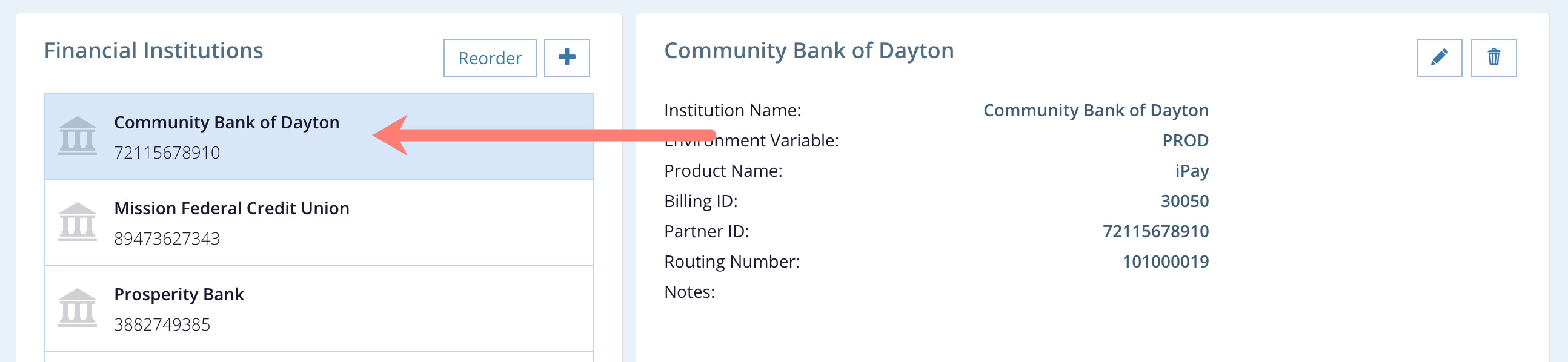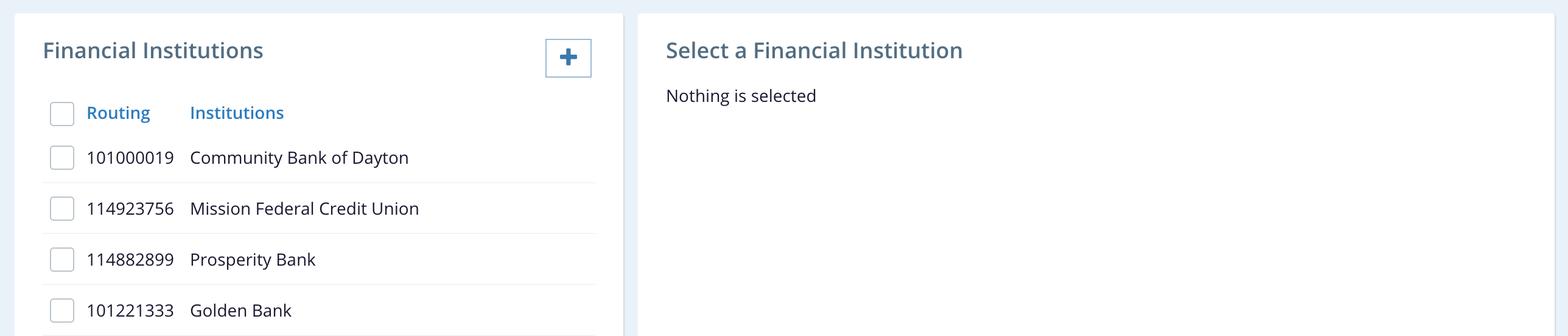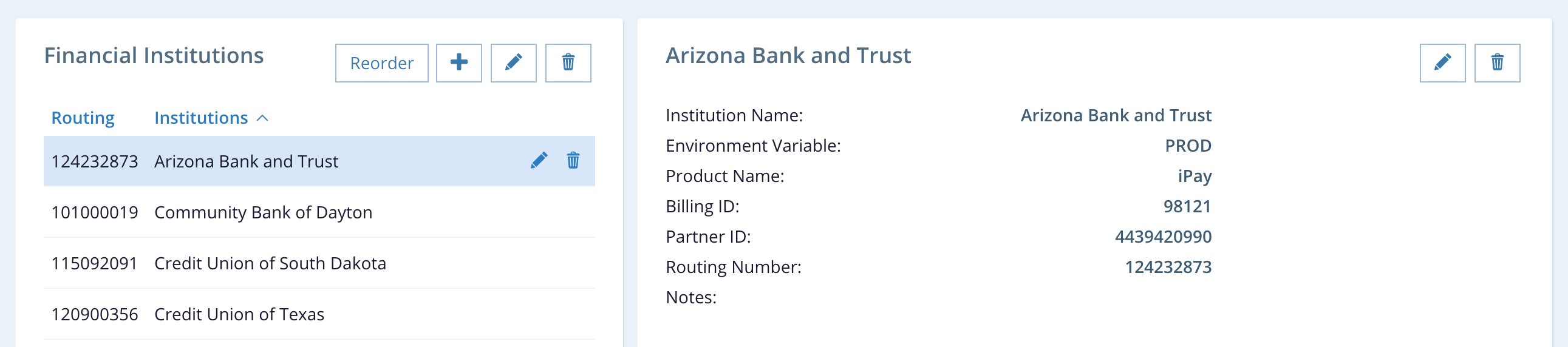 Using the example above, pressing the Edit shortcut button in the Golden Bank list item would immediately initiate the Edit functionality for that institution. It would also select the Golden Bank item in the master list, providing the user with even more visual confirmation that they’re editing Golden Bank.