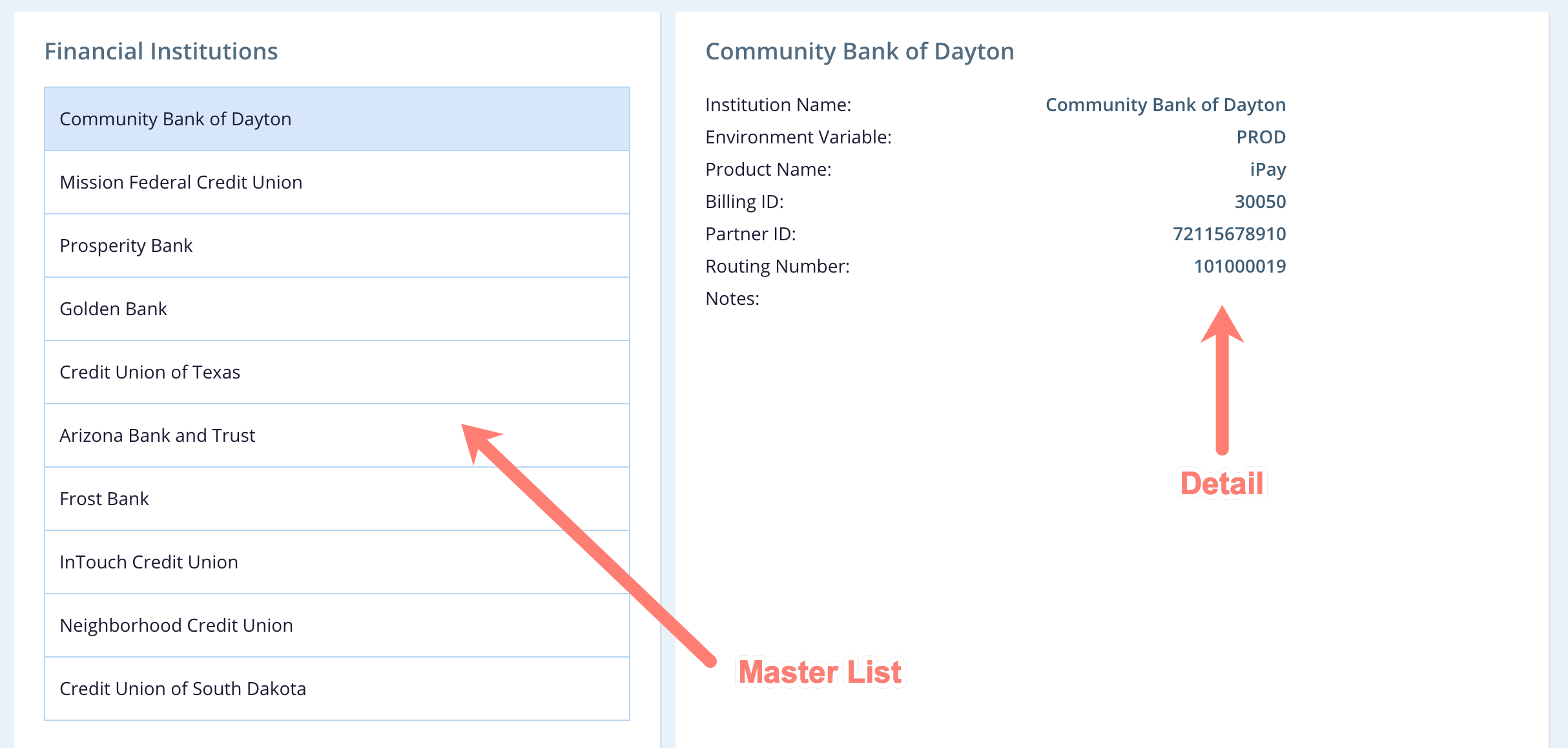- The detail display block title identifies the currently selected item, helping reinforce the relationship between the selected master list item and the detail area.