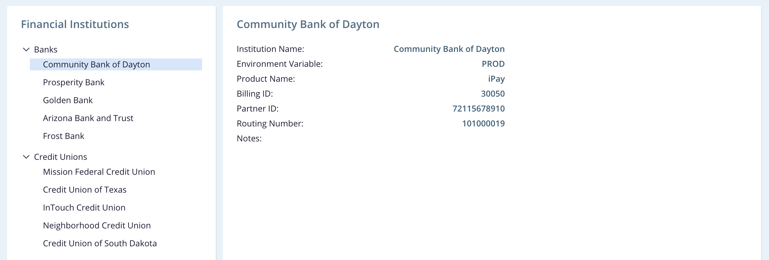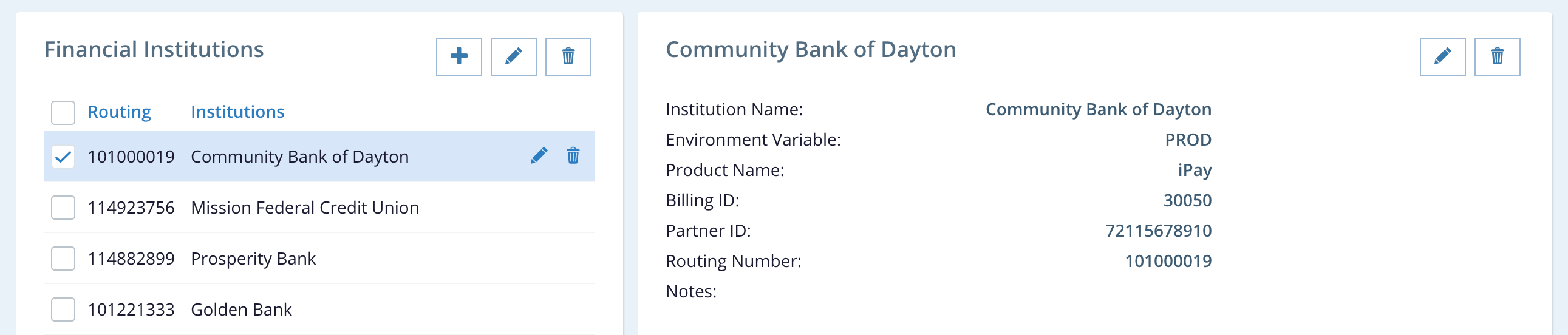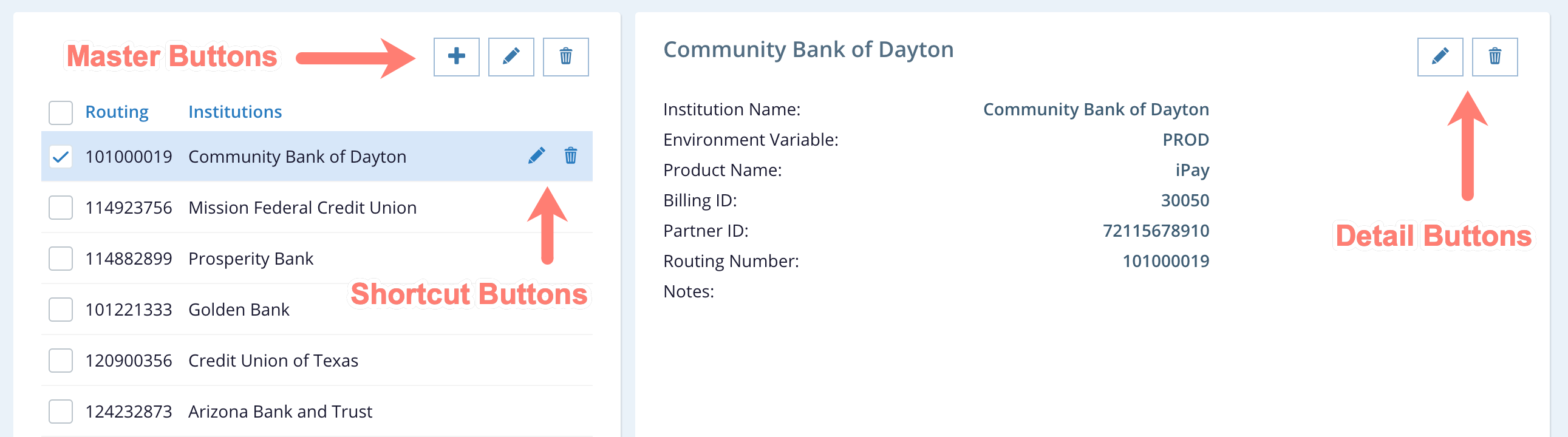 In many cases, the detail section provides additional functionality for the selected item. In the example below, we see Edit and Delete buttons that operate on the selected institution.