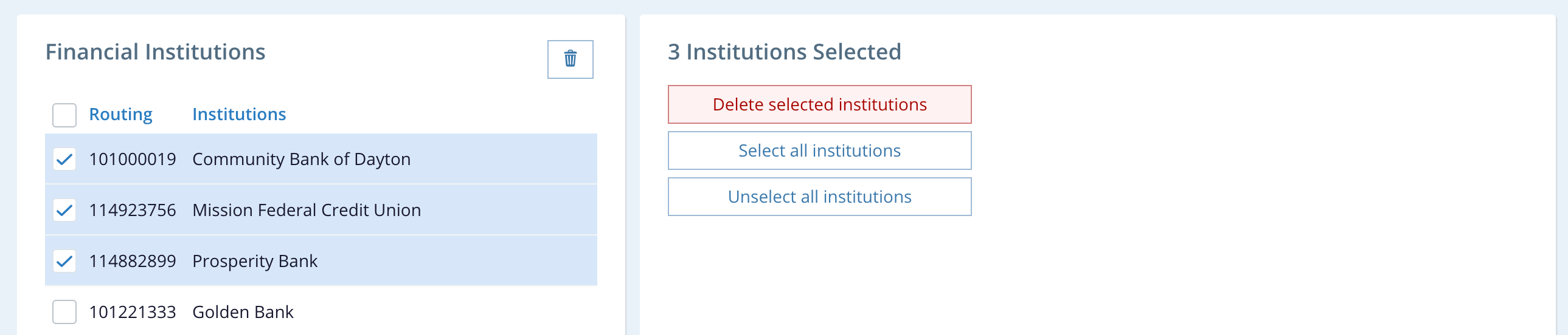- The detail display block title is “3 Institutions Selected”, helping the user understand that multiple items are selected and how many are selected.