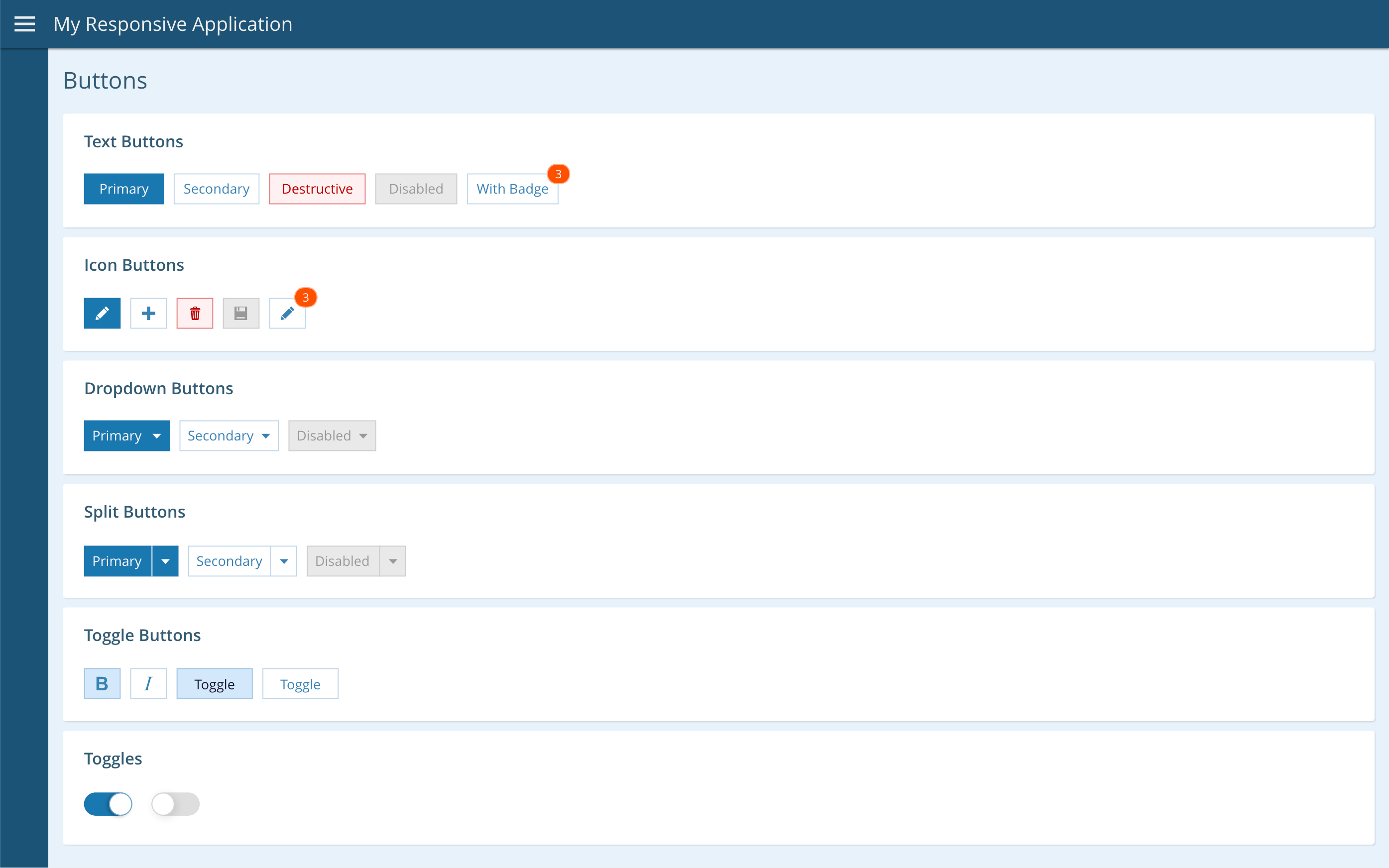 The disabled state for all buttons and the on/off states for toggling buttons are internal states within the development components, but we have provided separate design components for these states for each type of button.