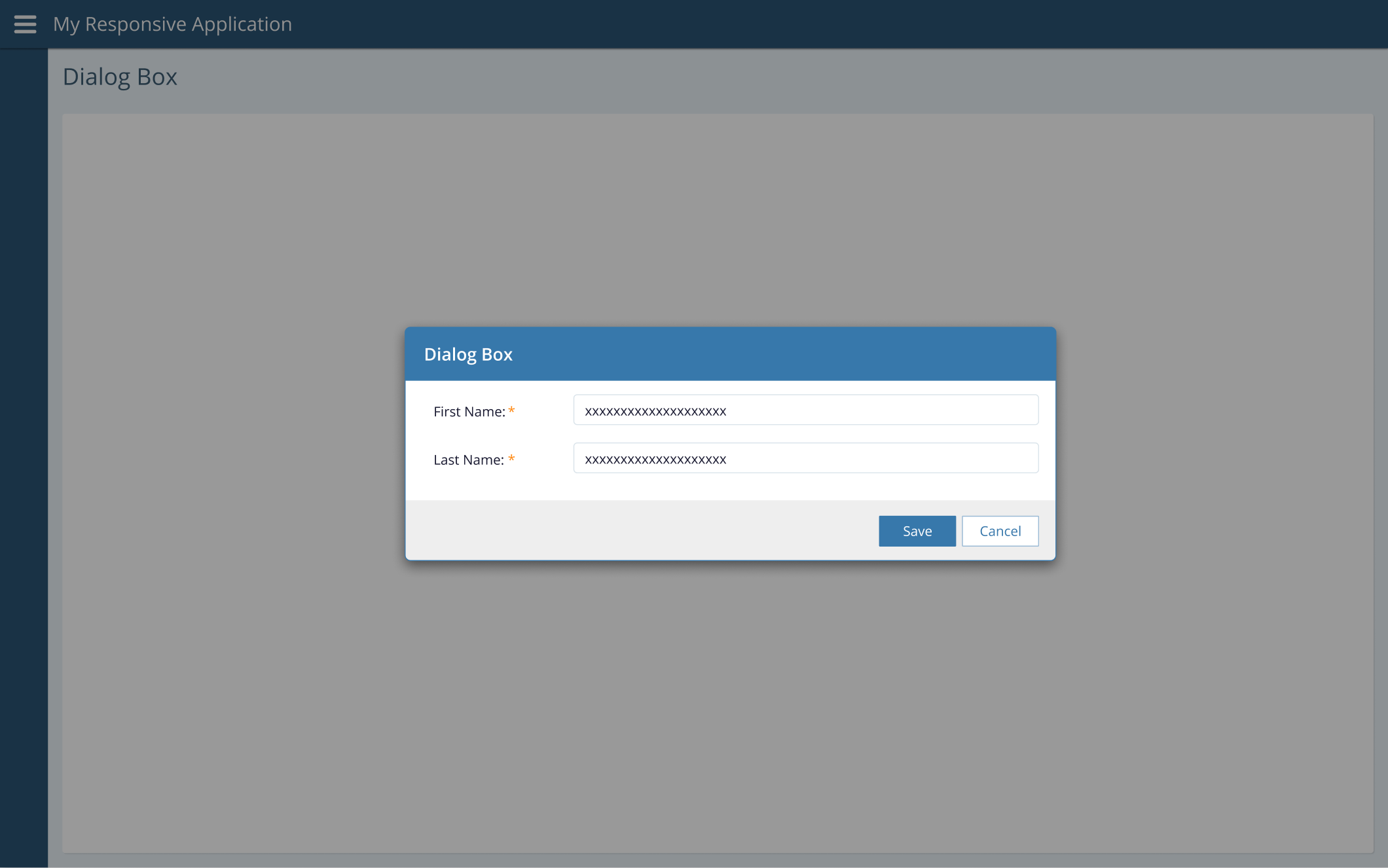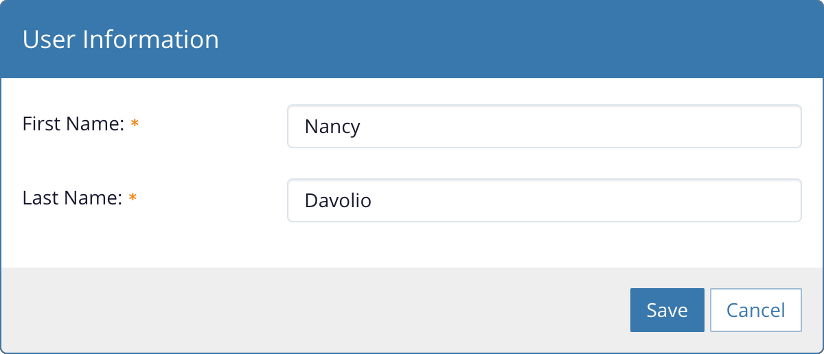 A dialog box can be used to prompt for user input then perform an action. In this case, display a title in the header, Save and Cancel buttons in the footer, and the appropriate input components in the content area.
