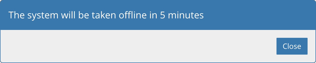 A dialog box can be used to display a simple message that the user must acknowledge. In this case, display the message in the dialog box header and include a single Close button, which closes the dialog with no further action. (Most simple messages are displayed using notifications; a dialog box should only be used for this purpose if it’s important for the user to acknowledge the message.)