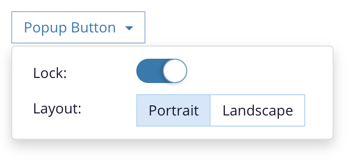 The popup button looks like a dropdown button at rest but can be used to display a small amount of content in a popup window when pressed. This gives you the freedom to create a small custom interaction in a popup without needing a dedicated enterprise component for the interaction.