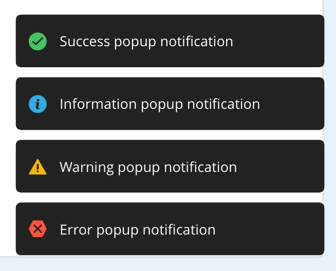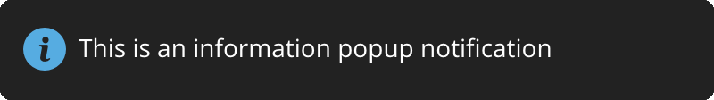 | type | string | 'information' | Specifies the type of popup notification styling to display. One of “information”, “success”, “error”, or “warning”. |