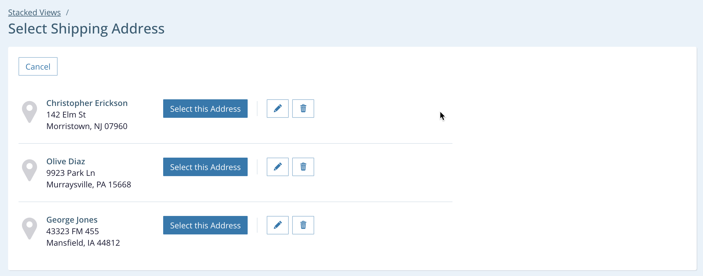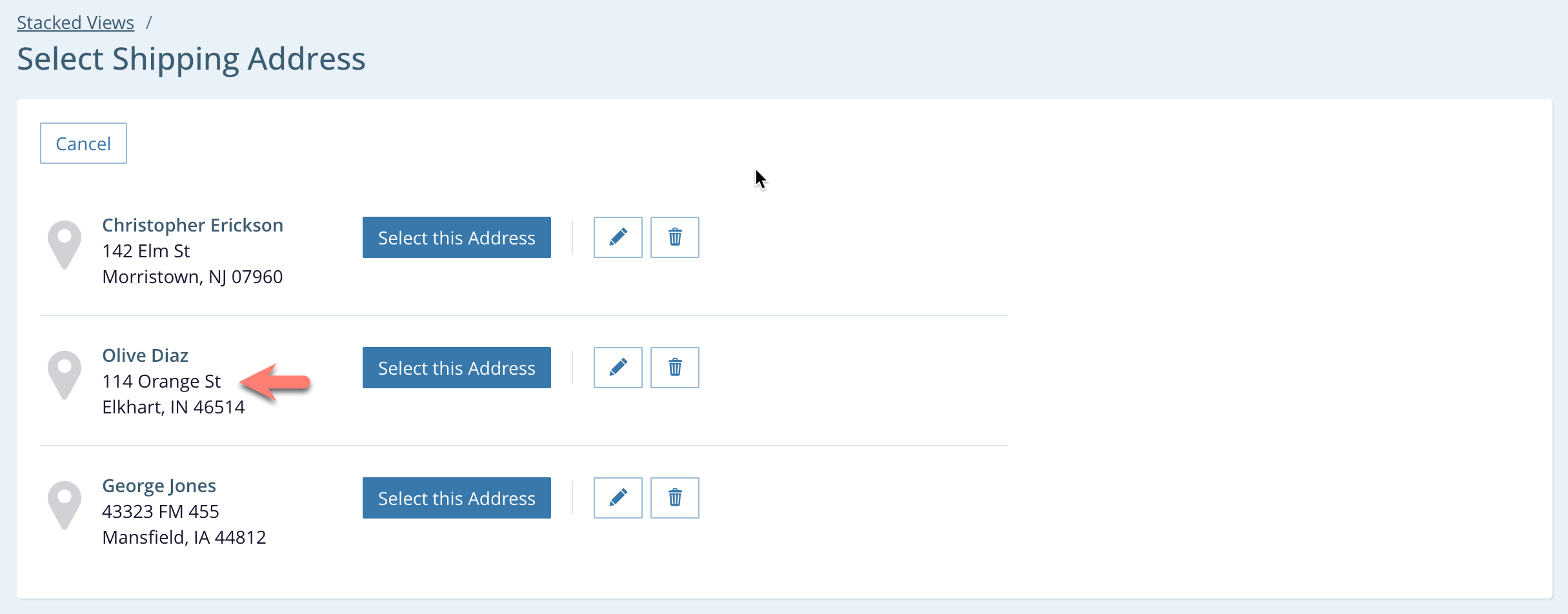 - The user can press the Select this Address button for any predefined address to use that address as the shipping address and return to the original order form. This is the primary action in the view. The application removes this stacked view when this happens.