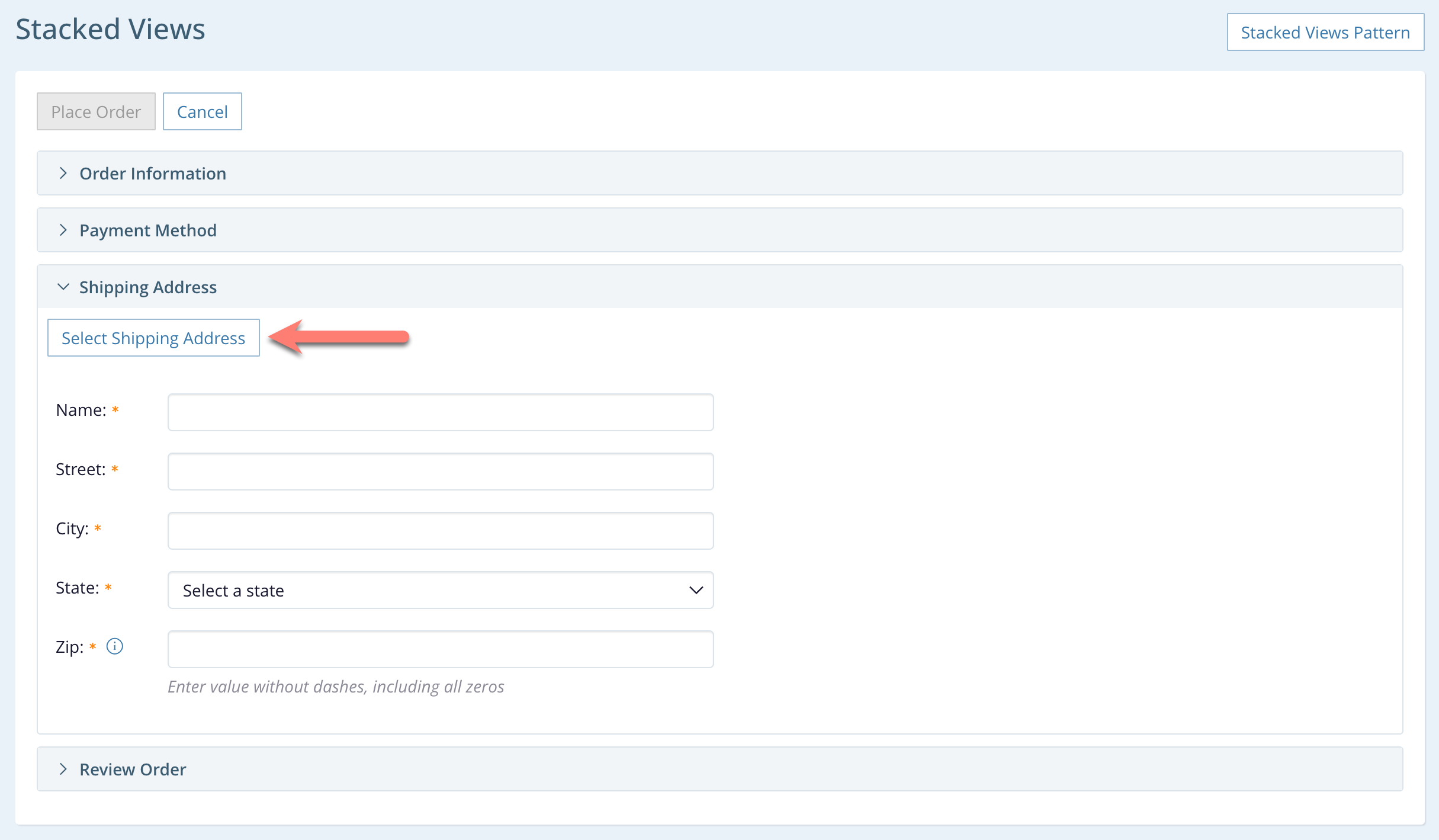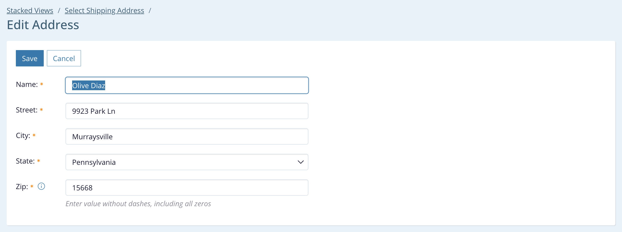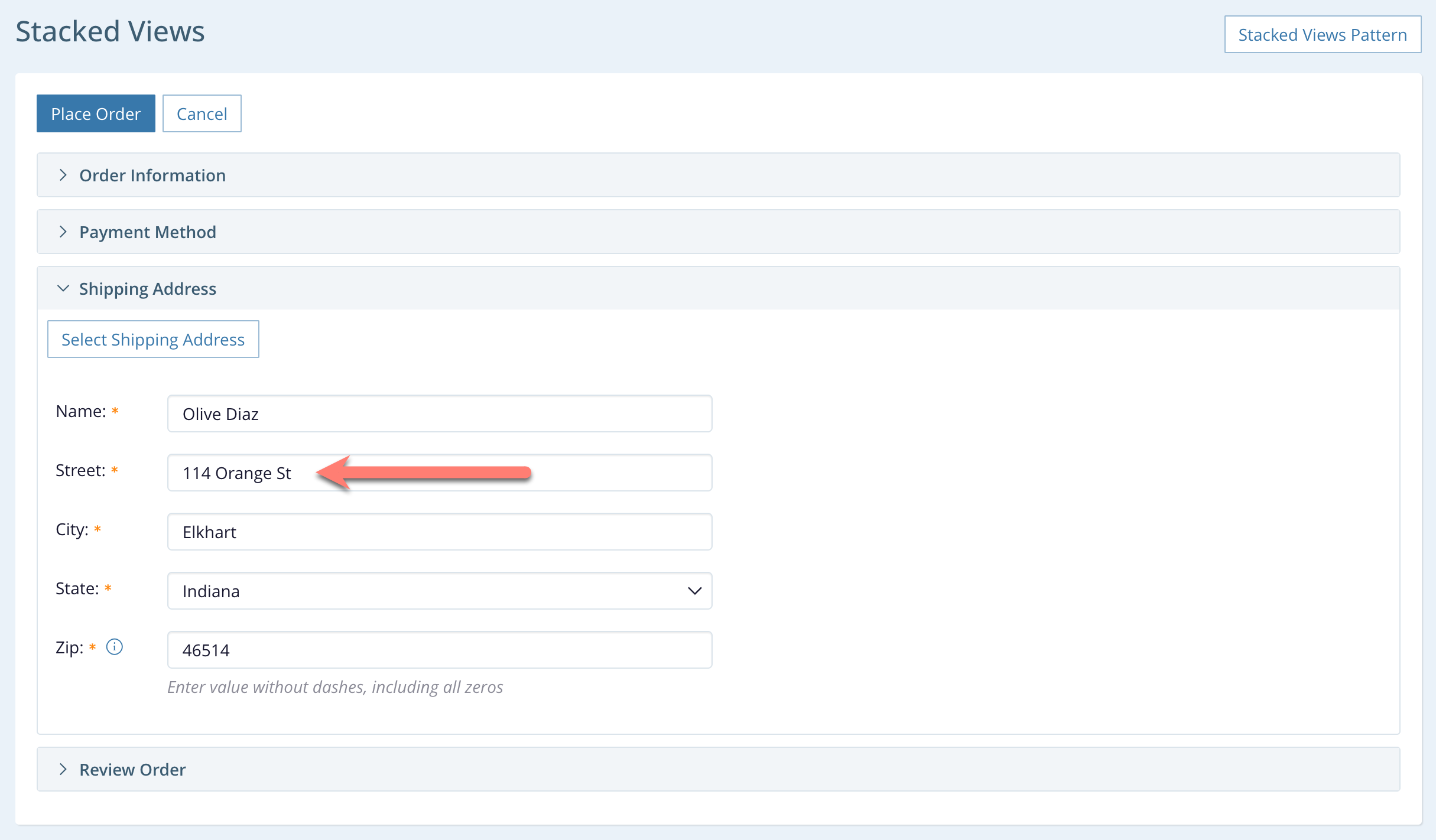 - The user can click the Stacked Views breadcrumb at the top to cancel both this activity and the shipping address selection, returning all the way back to the original order form. The application removes both stacked views when this happens (confirming loss of changes if appropriate).