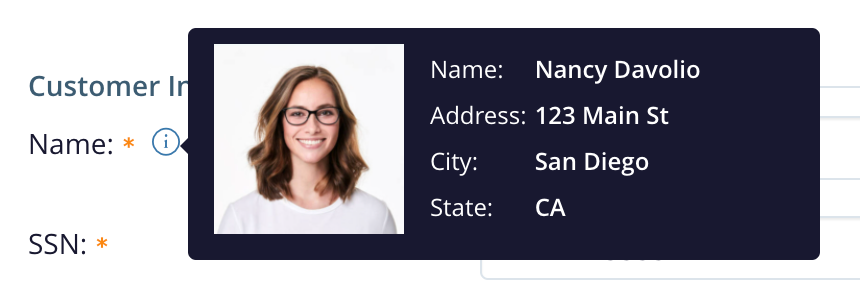 You can display more complex data than just simple text in rui-info-tooltip. The example below embeds a customer photo and tabular data in a field tooltip.