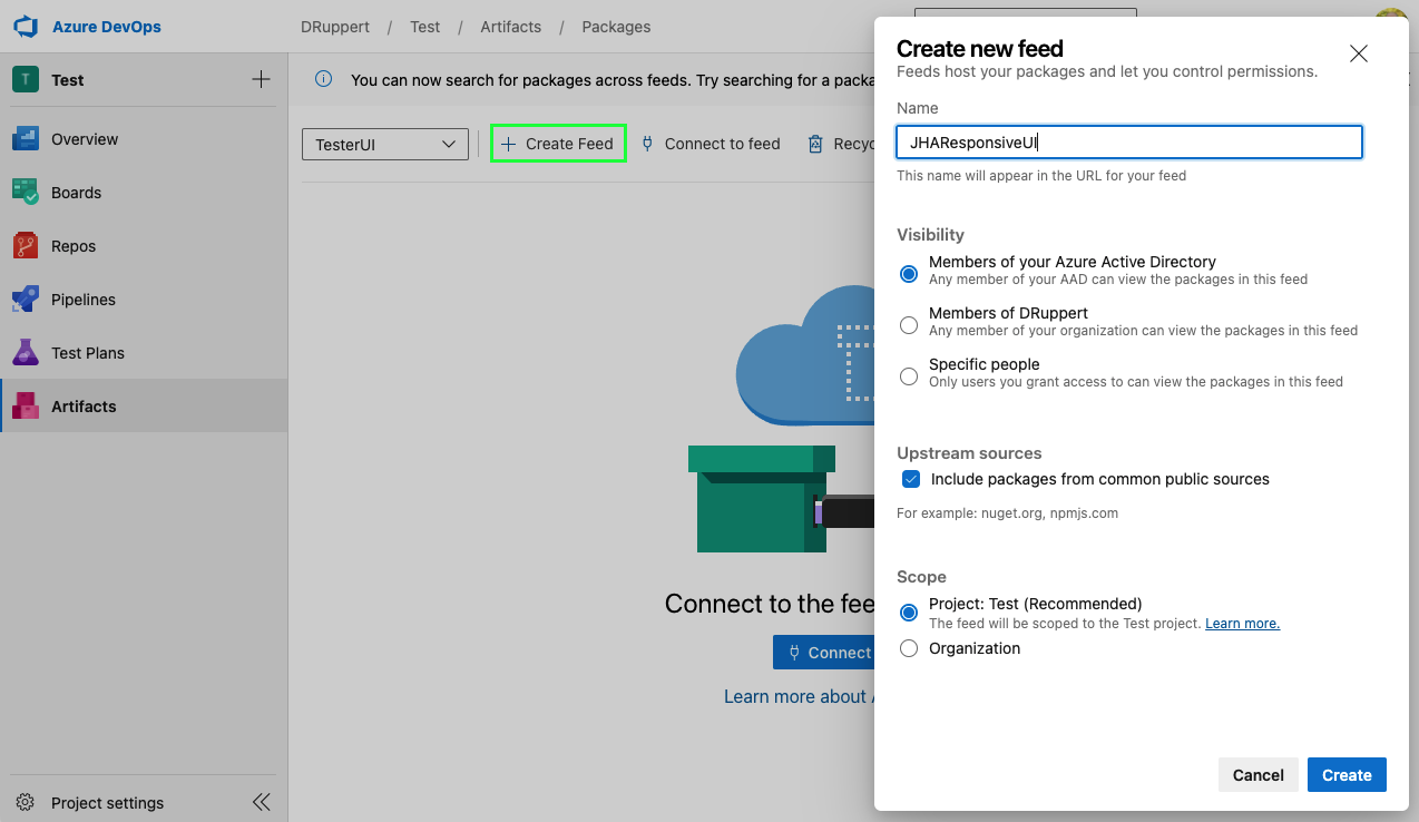 Creating a feed for an Azure DevOps project
