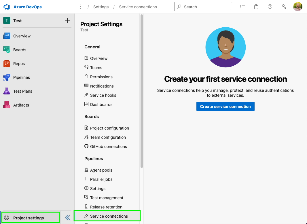 - To create a new Service Connection, go to the Service Connection page within the Pipelines section of your Azure Project Settings. Press the Create service connection button.