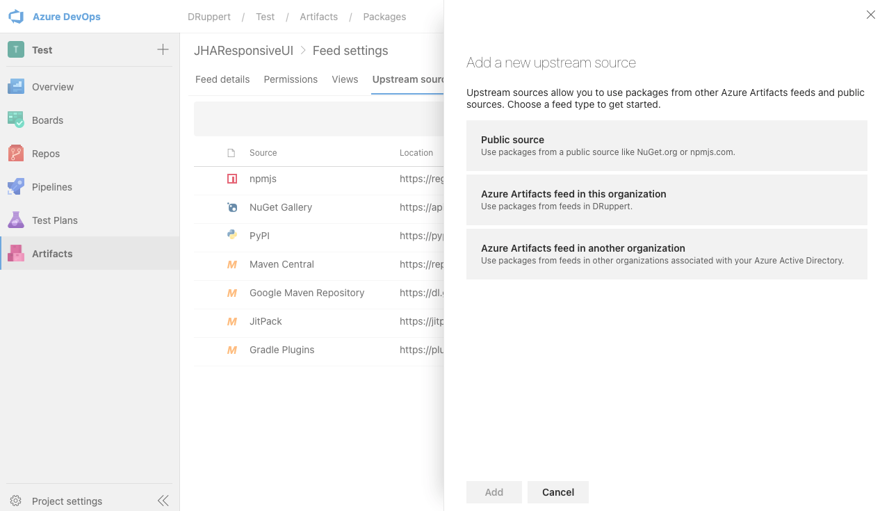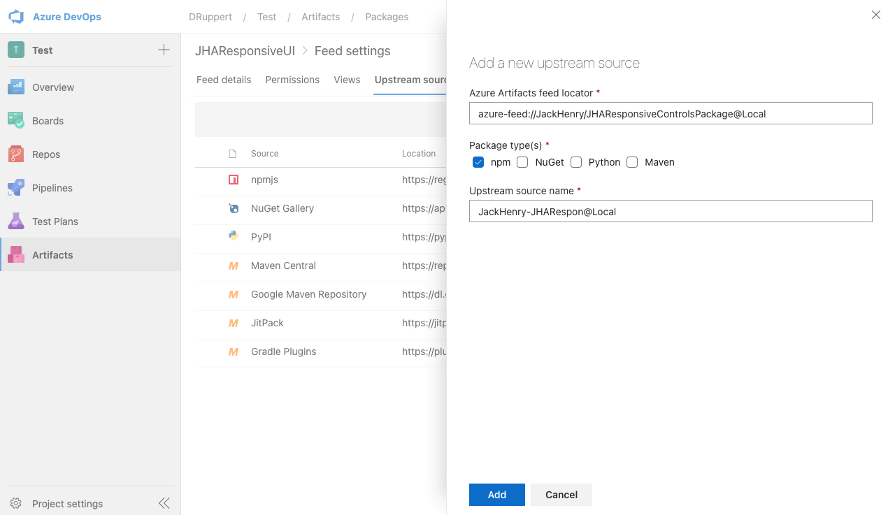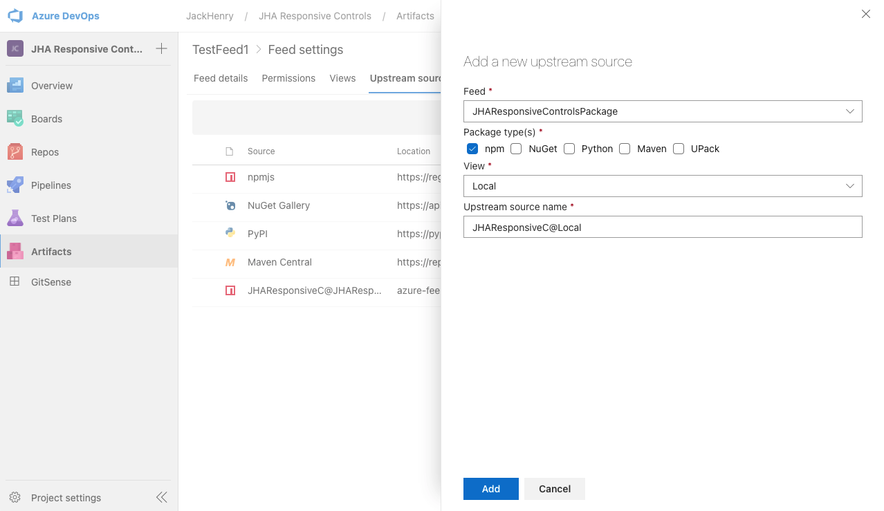 If your project is outside of the JackHenry organization, enter azure-feed://JackHenry/JHAResponsiveControlsPackage@Local for the Azure Artifacts feed locator. Then select npm for the Package type(s) and update the Upstream source name if you would like to customize it. Then press the Add button.