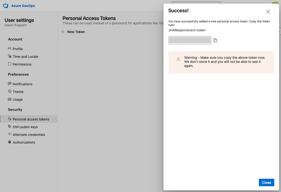 - Go back to the Azure DevOps PAT window and copy the token to the clipboard.