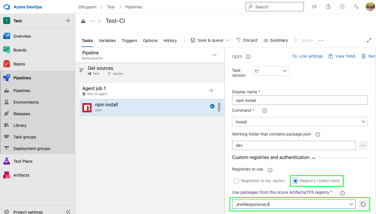 Once complete, you should be able to install the @jha/jharesponsive package during a pipeline build. Within the npm install task, expand Custom registries and authentication and select Registry I select here. Then select your feed from the dropdown.
